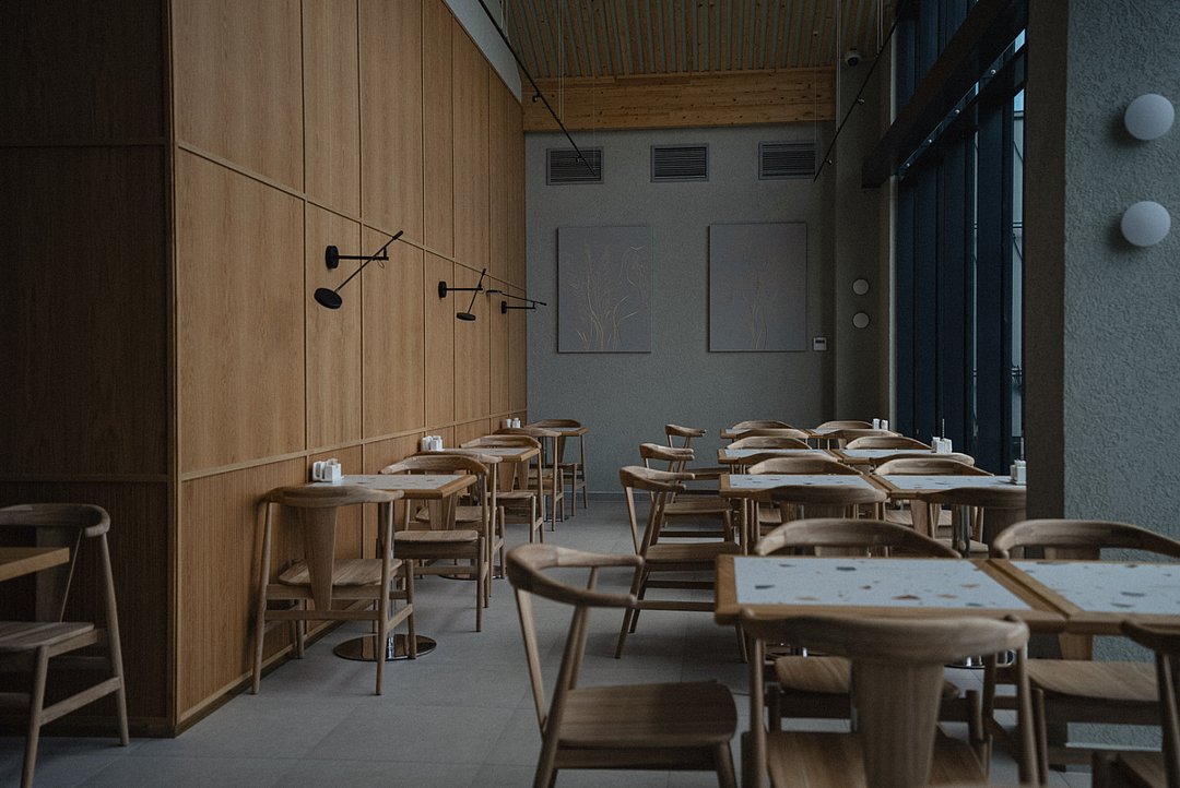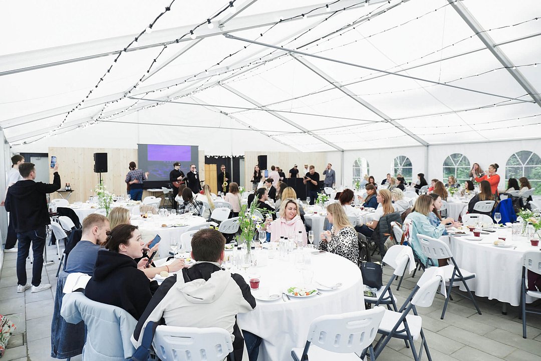 Мебель включает круглые и прямоугольные столы, а также мягкие банкетные стулья и коктейльные столики, что обеспечивает возможность гибкой настройки пространства для любого формата мероприятия.