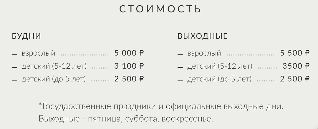 Выходные дни — пятница, суббота, воскресенье и государственные праздники.Аренда комплекса Малая парная Большая парная Будни (ПН-ЧТ) 15000 ₽ 30000 ₽ Дополнительный гость (продление на час) 3750 ₽ 3750 ₽ Выходные и праздники (ПТ–ВС) 19000 ₽ 38000 ₽ Дополнительный гость (продление на час) 4750 ₽ 4750 ₽ Детский сеанс от 2500 ₽ от 2500 ₽ Услуга оплачивается отдельноИнформация от 14 ноября 2025