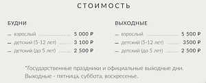 Выходные дни — пятница, суббота, воскресенье и государственные праздники.Аренда комплекса Малая парная Большая парная Будни (ПН-ЧТ) 15000 ₽ 30000 ₽ Дополнительный гость (продление на час) 3750 ₽ 3750 ₽ Выходные и праздники (ПТ–ВС) 19000 ₽ 38000 ₽ Дополнительный гость (продление на час) 4750 ₽ 4750 ₽ Детский сеанс от 2500 ₽ от 2500 ₽ Банный комплекс