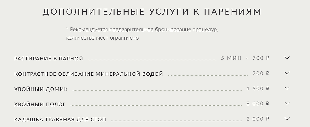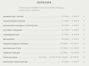 В стоимость входит коллективное аромапарение, банный текстиль и тапочки, чай с сушками, косметика и средства личной гигиены, а также сопровождение администратора и пар-мастера.