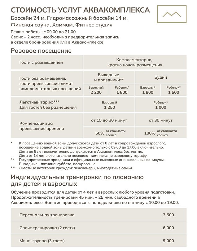 В связи с проведением ремонтных работ для гостей доступна только аквазона: 24-метровый бассейн и гидромассажный бассейн. Термальная зона будет доступна с 15 декабря 2025 года.