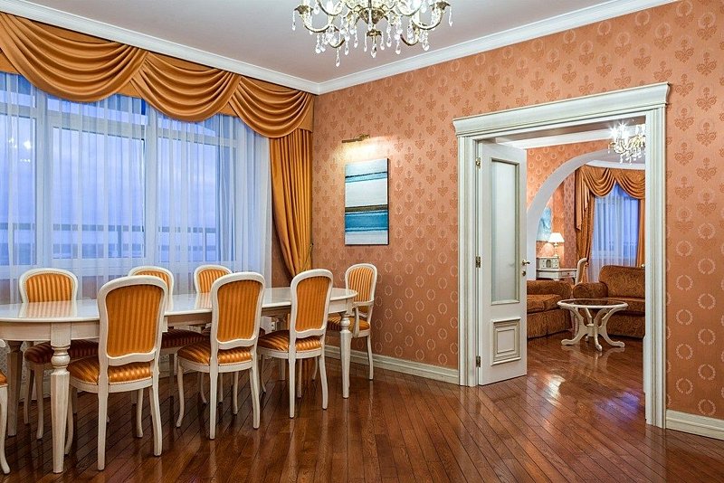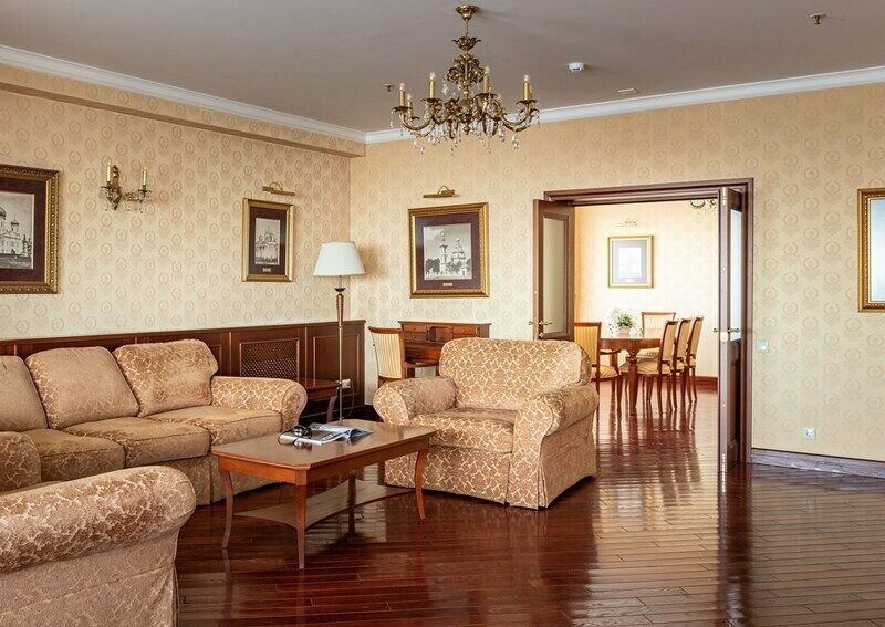 Гранд Люкс Cosmos идеально подойдет для гостей, отдающих предпочтения просторному интерьеру в классических бежево-коричневых цветах.