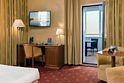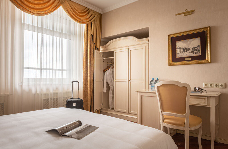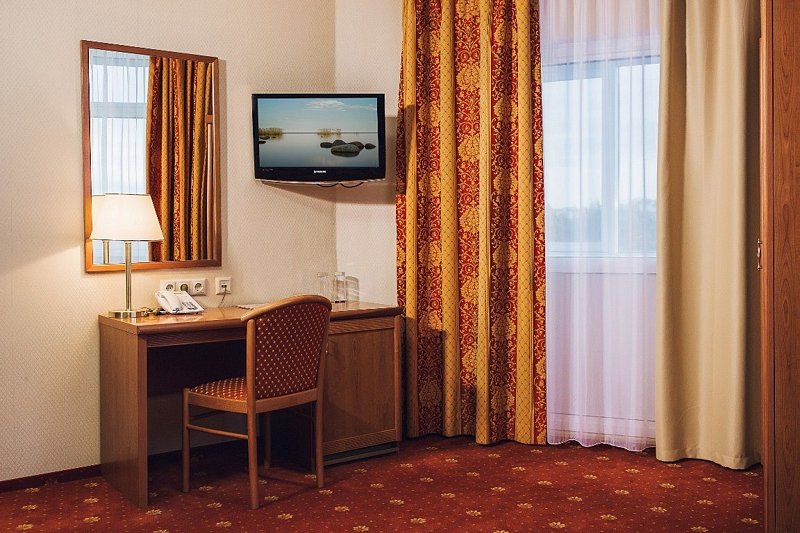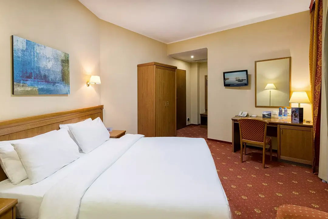 Стандартный номер, где есть всё необходимое и даже больше. Двуспальная кровать с ортопедическим матрасом и меню подушек, телевизор, сейф для ценных вещей.