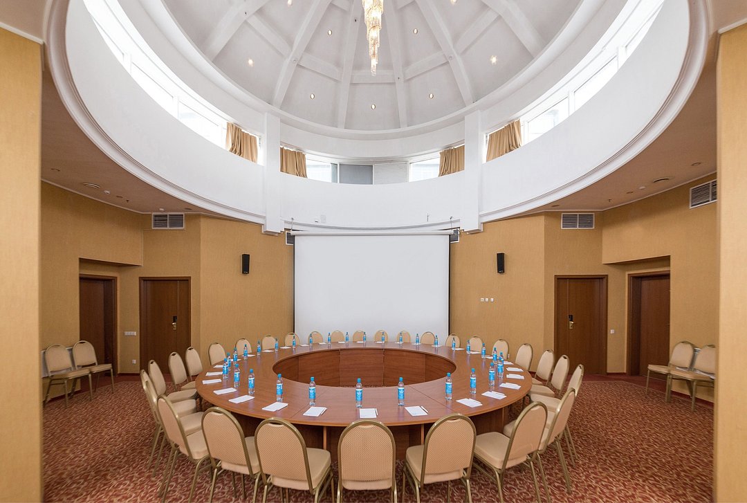 Элегантный зал Гелиос круглой формы с хрустальной люстрой под куполом позволяет выбрать различные виды рассадки: Круглый стол, Театр, Класс, Коктейль, Фуршет. Зал оснащён экраном, проектором, звуковым оборудованием и беспроводным интернетом.