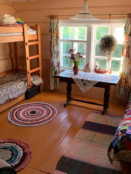 В доме есть спальня, рассчитанная на 4 гостей, кухня и веранда. На веранде при желании может разместиться ещё один человек. Есть газовая плита, чайник, холодильник, печка. Санузел находится на улице.
