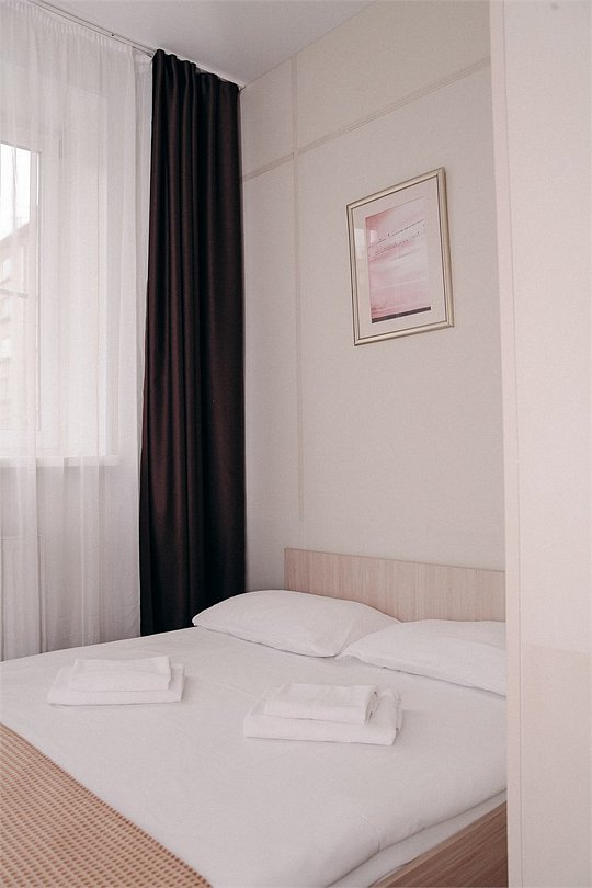 Элегантный и компактный номер для комфортного отдыха. Светлая отделка и минималистичный дизайн создают атмосферу уюта. Просторное окно обеспечивает помещение естественным светом, а плотные шторы позволяют регулировать освещенность. Удобная кровать гарантирует расслабляющий сон. Есть рабочая зона с письменным столом.Услуги и удобства