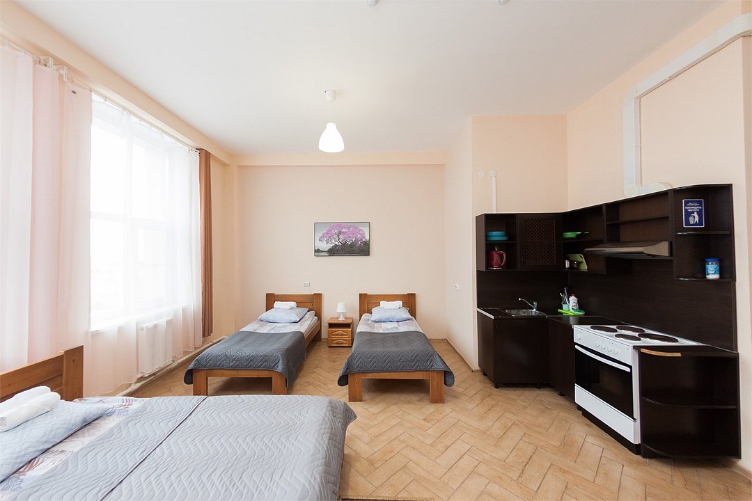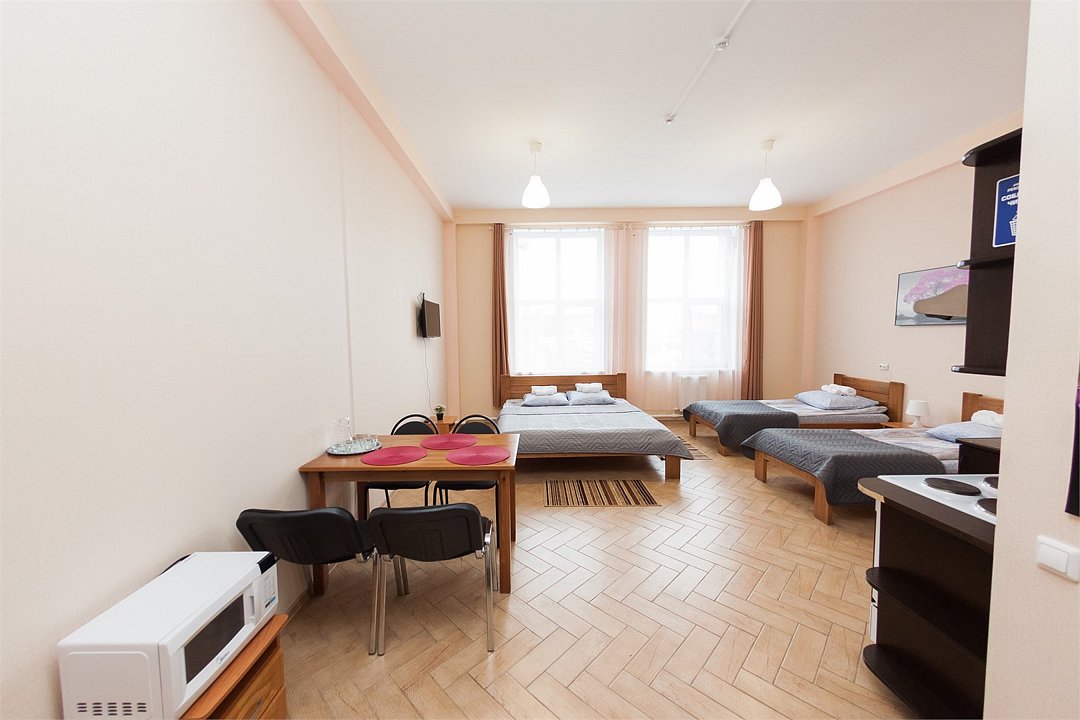 телевизор, Wi-Fi, холодильник, фен, плита для приготовления пищи, микроволновая печь, вешалки, обеденный стол, набор посуды, обслуживание номеров, чайник, обеденная зона, отопление, отдельный вход в номер, душ, плиточное покрытие, общая ванная комната, вид во двор, четыре односпальные кровати, стул, тумба, туалетные средства, туалет, мини-кухня, москитная сетка, мыло, без питомцевВ гостиничном номере