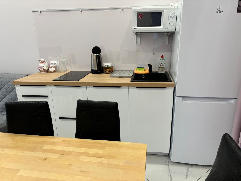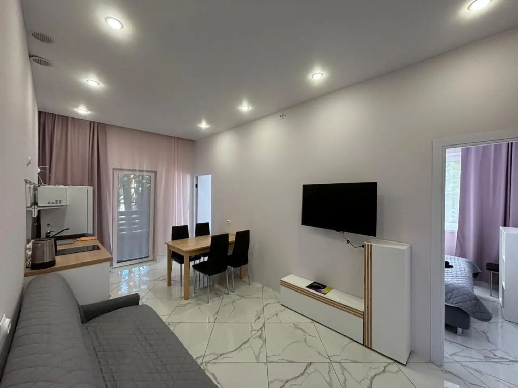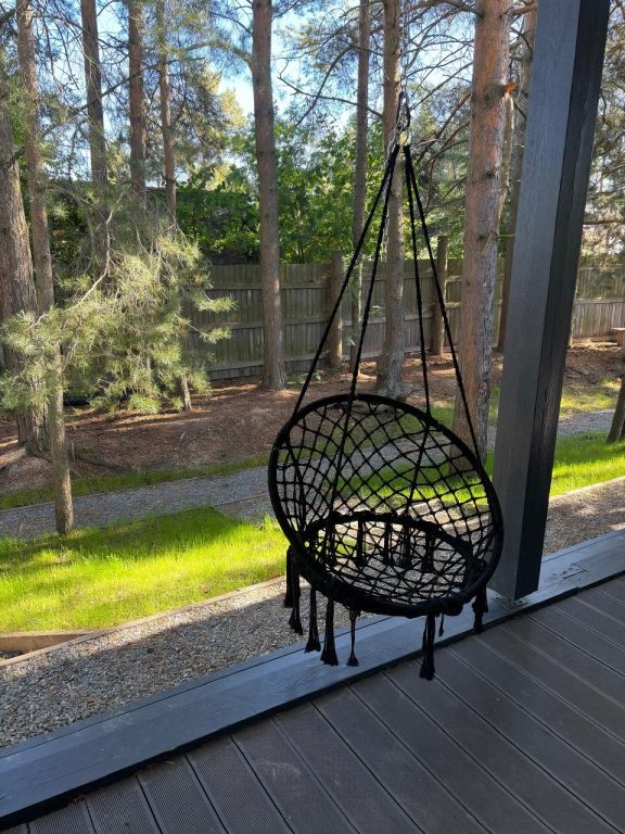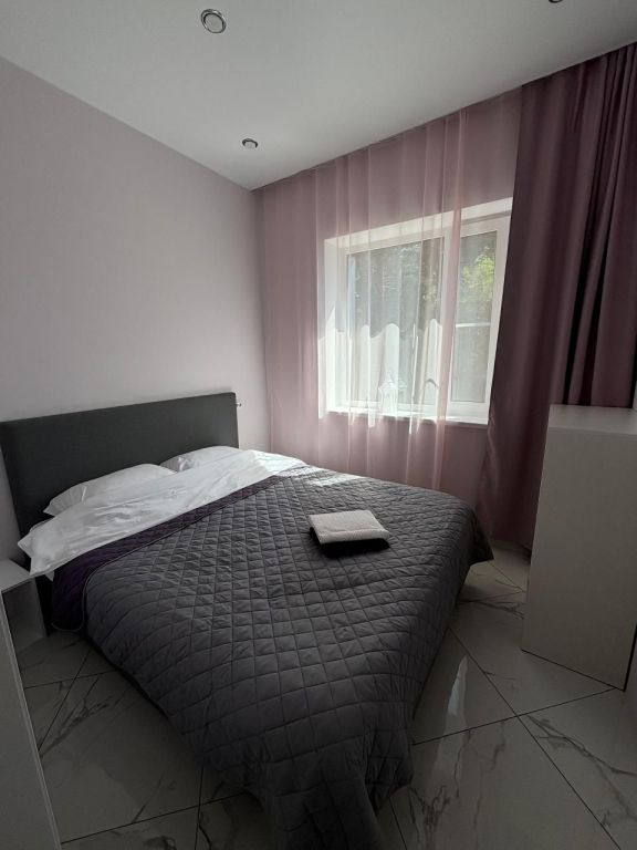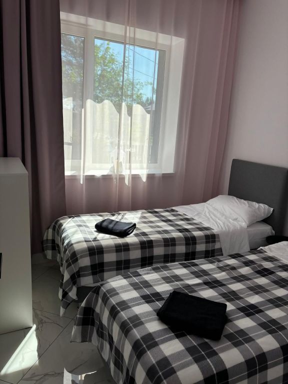 Гостевой дом имеет 2 спальни и гостиную, совмещённую с кухонной зоной. Первая спальня оснащена двуспальной кроватью 160х200 см, вторая — двумя односпальными кроватями 80х200 см. Также в распоряжении гостей дополнительное спальное место — диван 140х200 см. По запросу предоставляются кровать-манеж и стул для кормления.