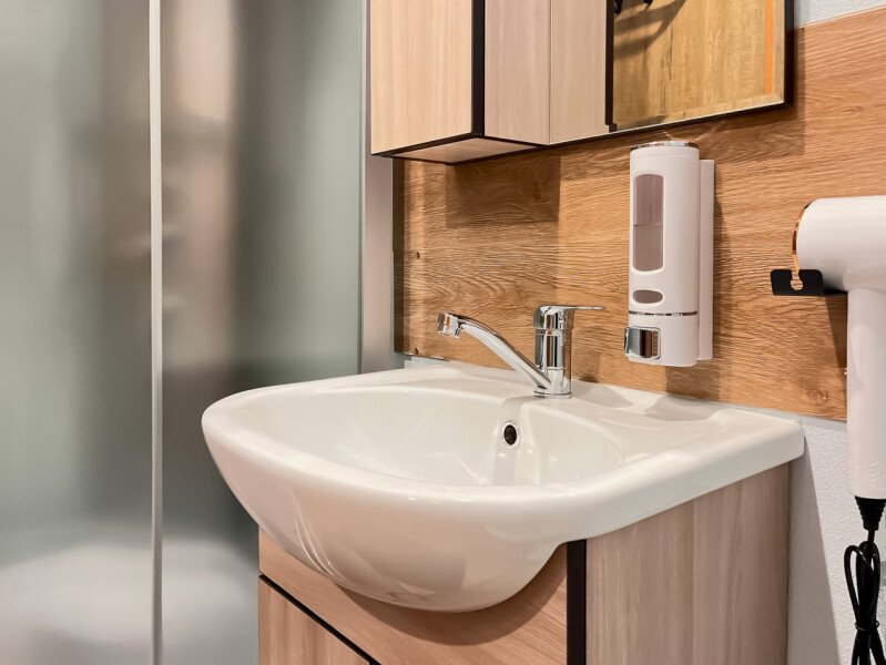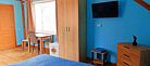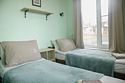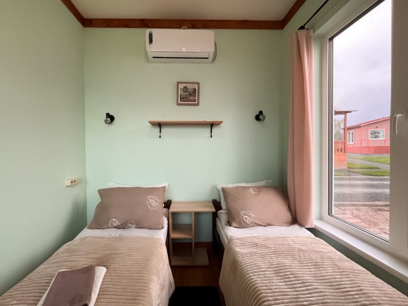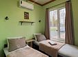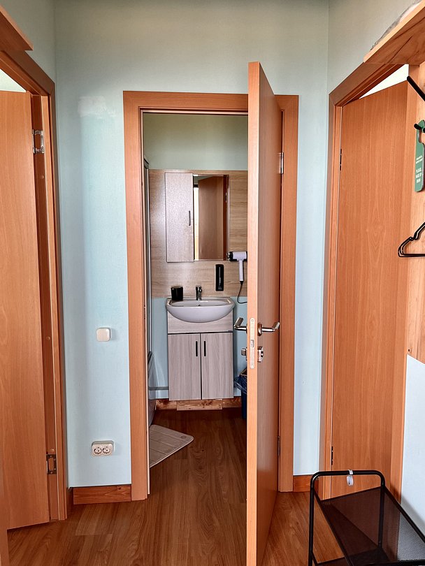 В номере: две односпальные кровати (или одна двуспальная по запросу), комод, тумбочки, вешалка и кондиционер. Санузел с душевой кабиной и феном общий на два номера. Если бронируете только один номер, возможно совместное использование санузла с другими гостями.
