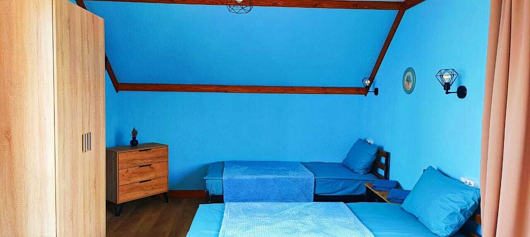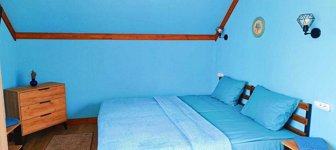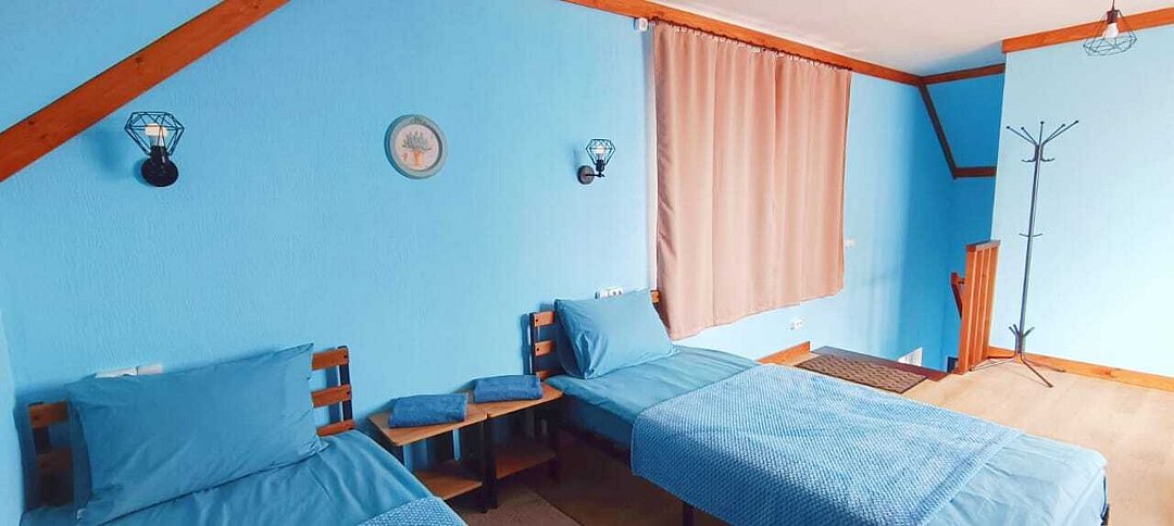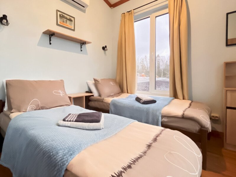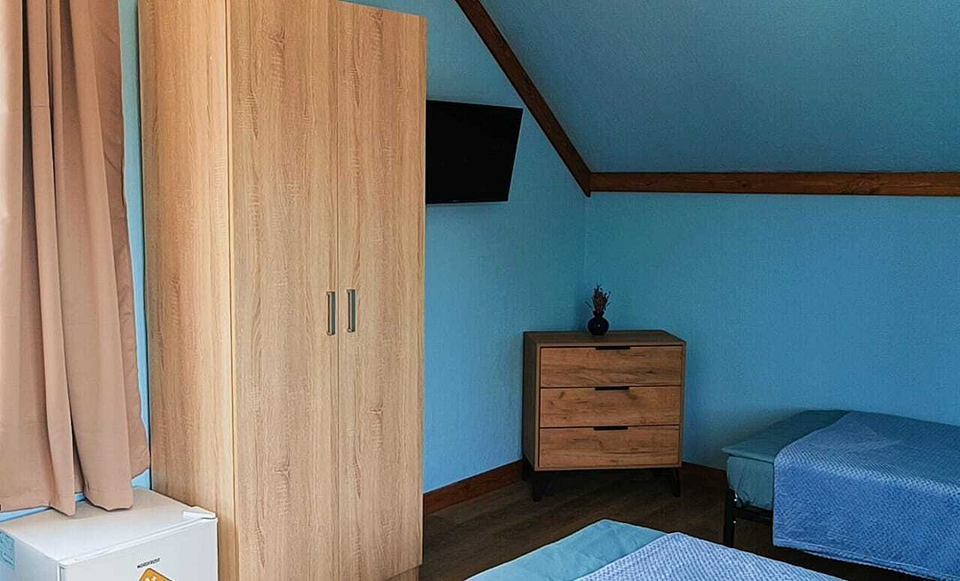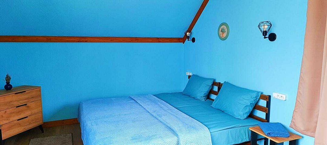 Две комнаты в трехкомнатном доме с мансардой. Уютный двухэтажный номер идеально подходит для отдыха небольшой компании друзей. Номер рассчитан на проживание 2–4 человек (два основных и два дополнительных места).