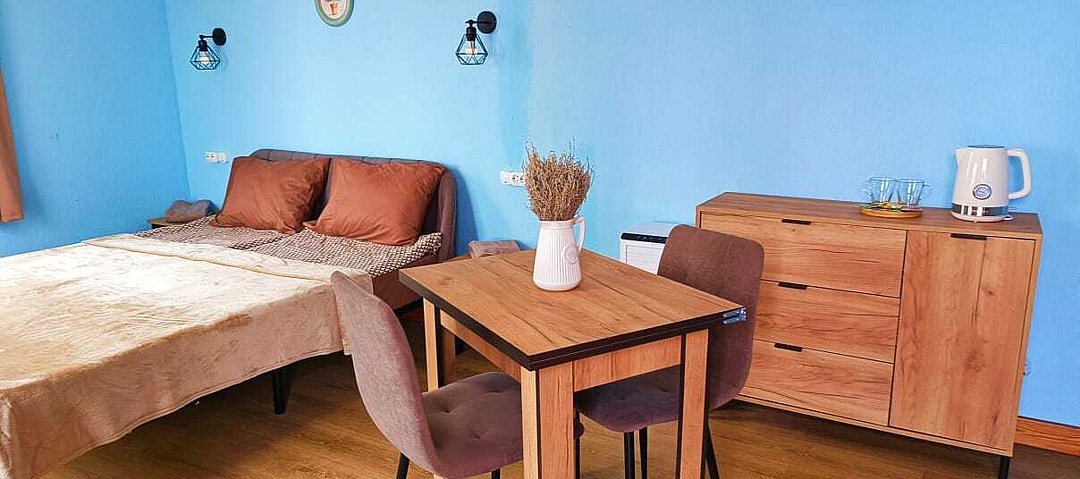 В одной комнате - удобный диван с спальным местом, в другой - двуспальная или две односпальные кровати (на ваш выбор). В номере также есть прихожая и санузел с душевой кабиной.