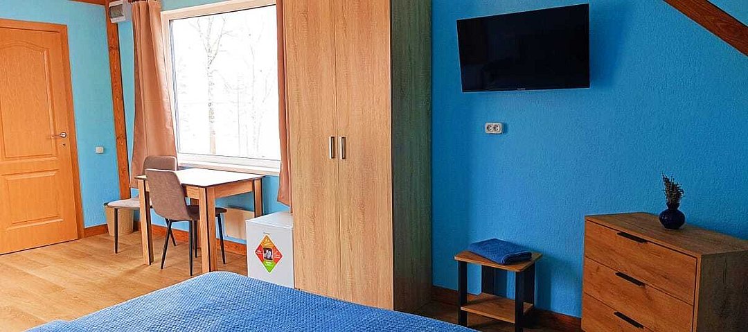 Для вашего удобства в номере имеется двухспальная кровать, шкаф для одежды, 2 комода, прикроватные тумбочки, стол, 2 стула, вешалка, чайник, телевизор, холодильник, вентилятор, отдельный санузел с душевой кабиной и феном . На территории нашей базы организована охраняемая парковка. Из больших окон номера открываются прекрасные виды на озеро, лес и окрестности, позволяя наслаждаться природой в любое время года.