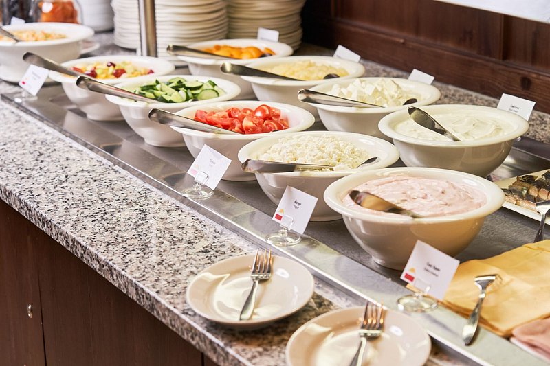 В ресторане каждый день с 07:00 – 11:00 гостей ждет разнообразный завтрак «Шведский стол». В меню представлены горячие блюда, такие как каши, блинчики с различными начинками, сосиски, яйца и творожная запеканка. Также доступны мясные, сырные и овощные нарезки, мягкие сыры, сухие завтраки, свежие фрукты и фруктовый салат, а также домашний хлеб и выпечка. Напитки включают воду, соки и горячие напитки.