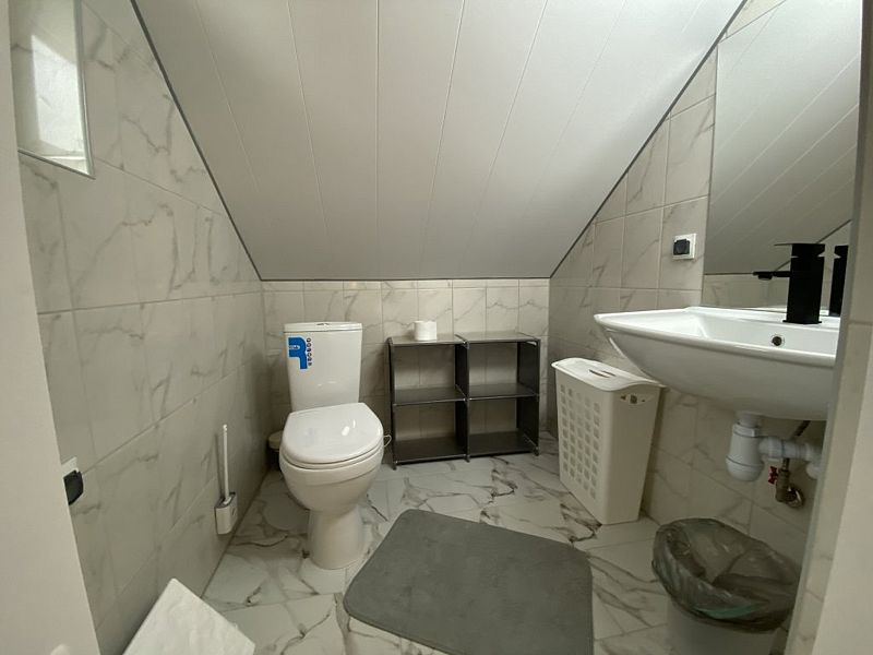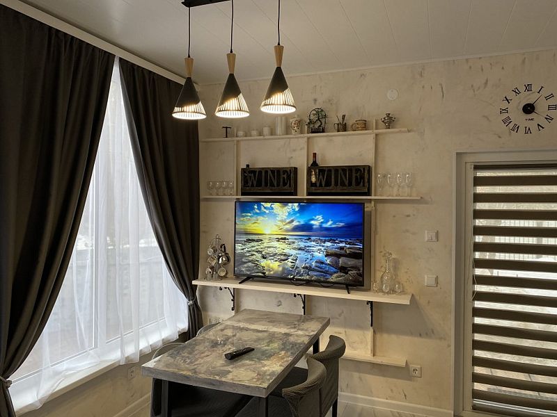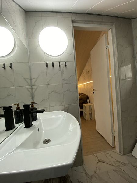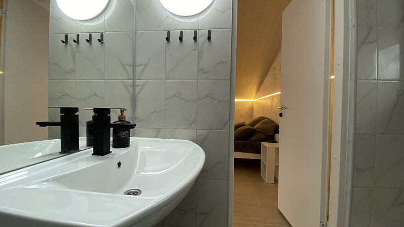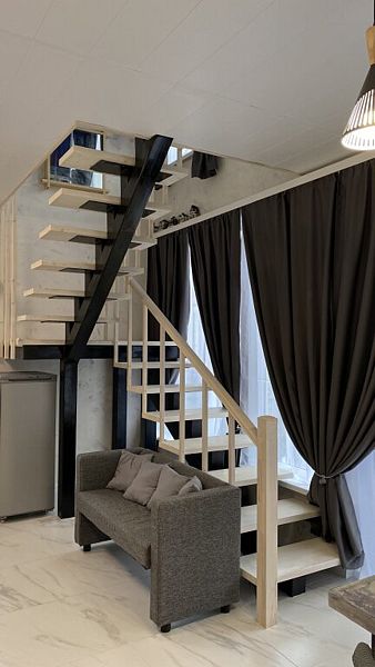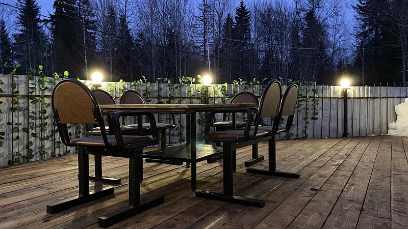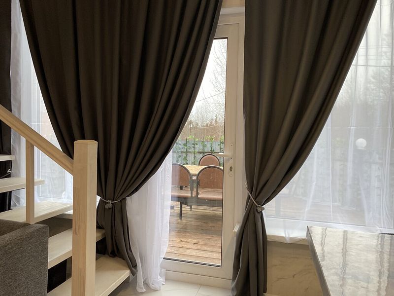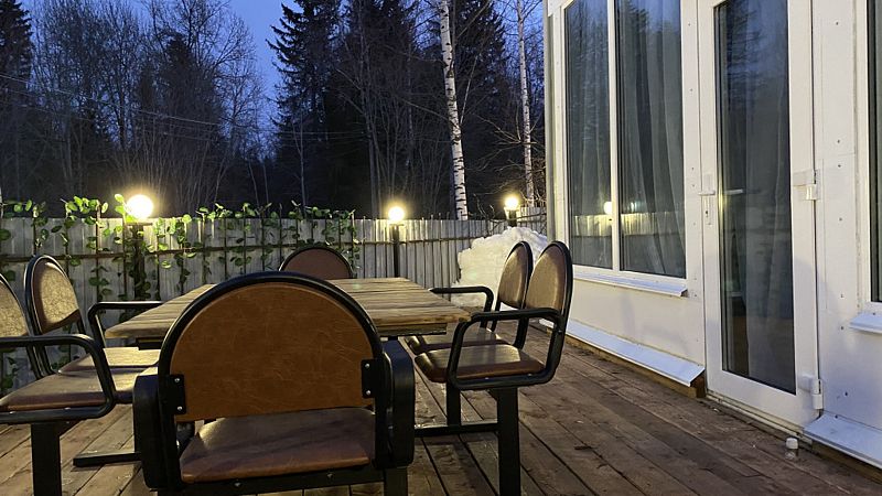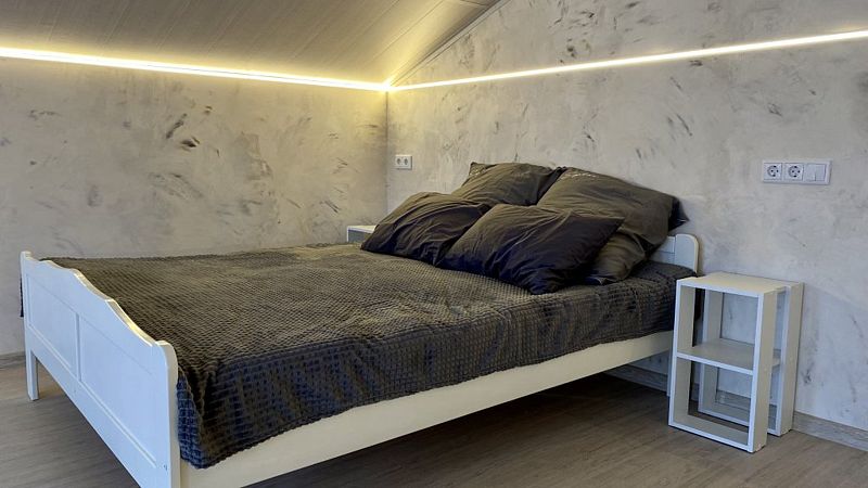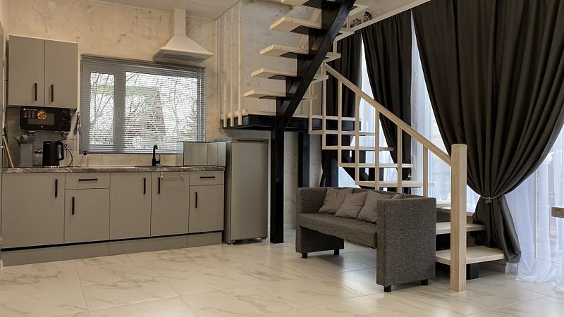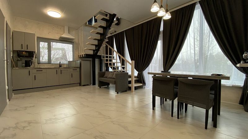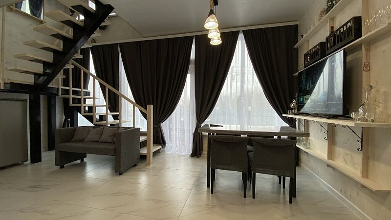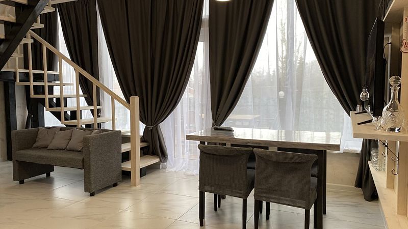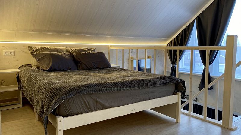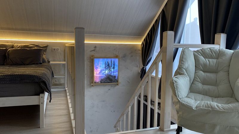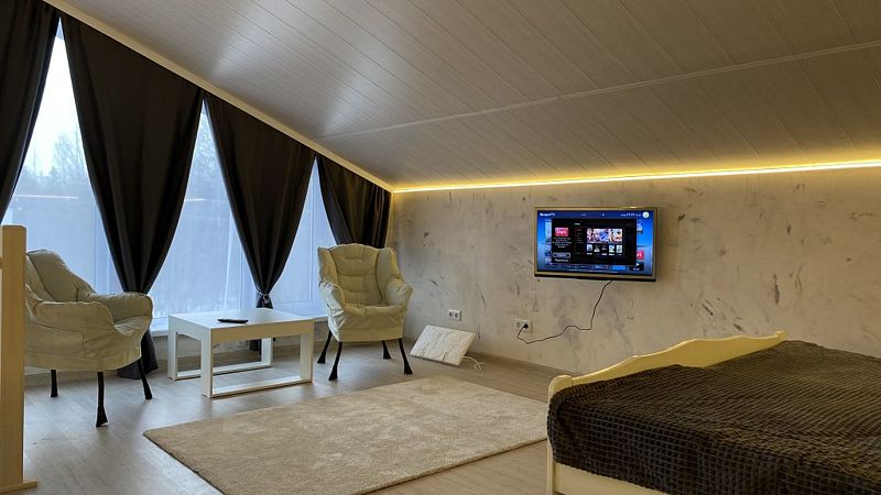 В доме 2 этажа и 1 спальня на 2 двуспальные кровати, также в коттедже есть кухня, обеденная зона в доме и на террасе у дома, душ, два туалета с раковинами, электросауна, которая нагревается до 85-90 градусов, 2 TV-зоны, оборудованные smart-tv. Гостям доступны дополнительные услуги на выбор, например: мини спа-программа с сауной и массажем.