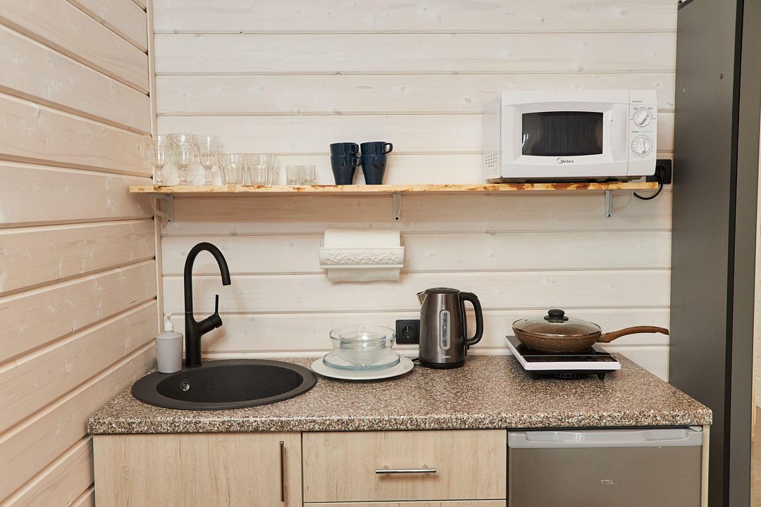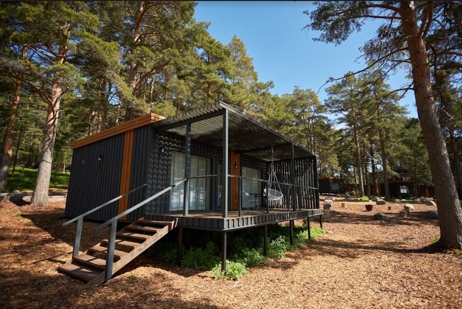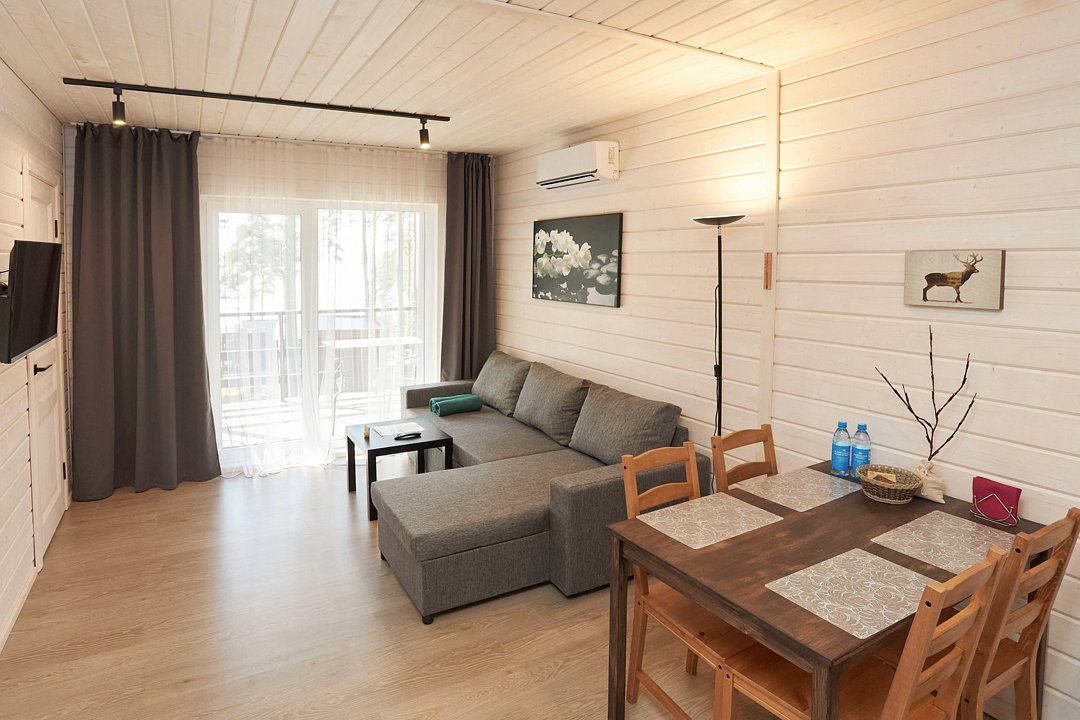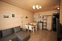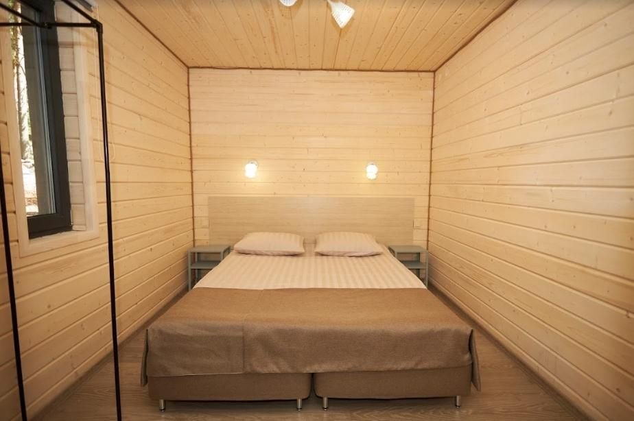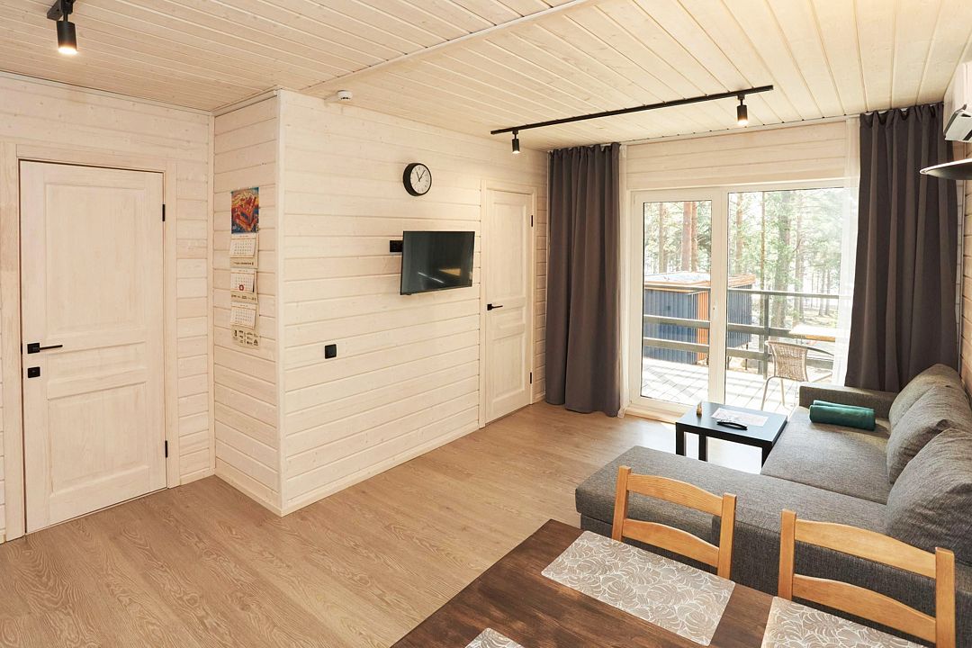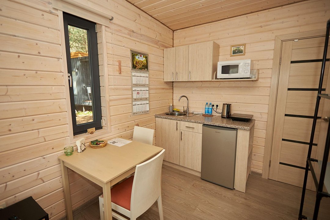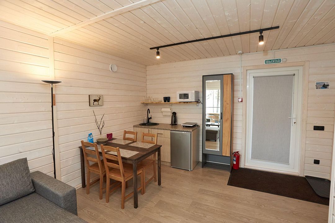 В каждом домике есть спальня с двухместной кроватью (с возможностью разделения спальных мест); гостиная с диваном, на котором возможно разместить еще до двух гостей, за доплату; кухня со всем необходимым (холодильник, чайник, плита с одной конфоркой, микроволновка, посуда для приготовления и приема пищи); санузел с горячим душем и туалетом; небольшая электрическая сауна, нагревается до 60–70°C; Smart TV и WiFi; кондиционер.
