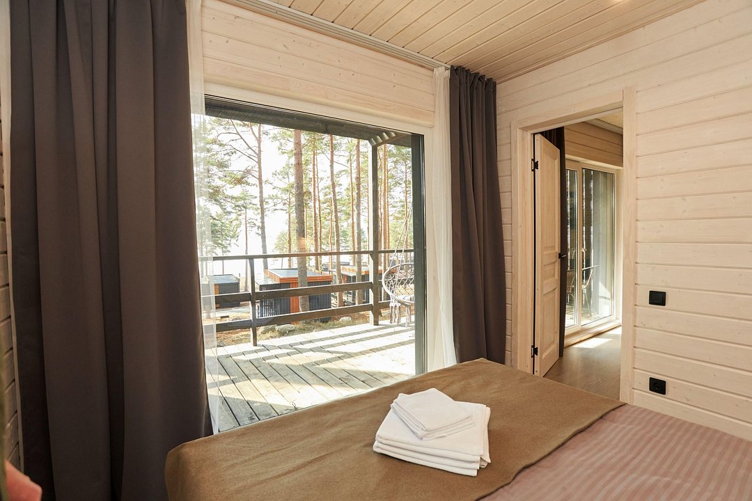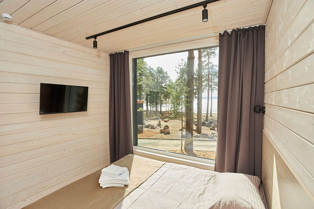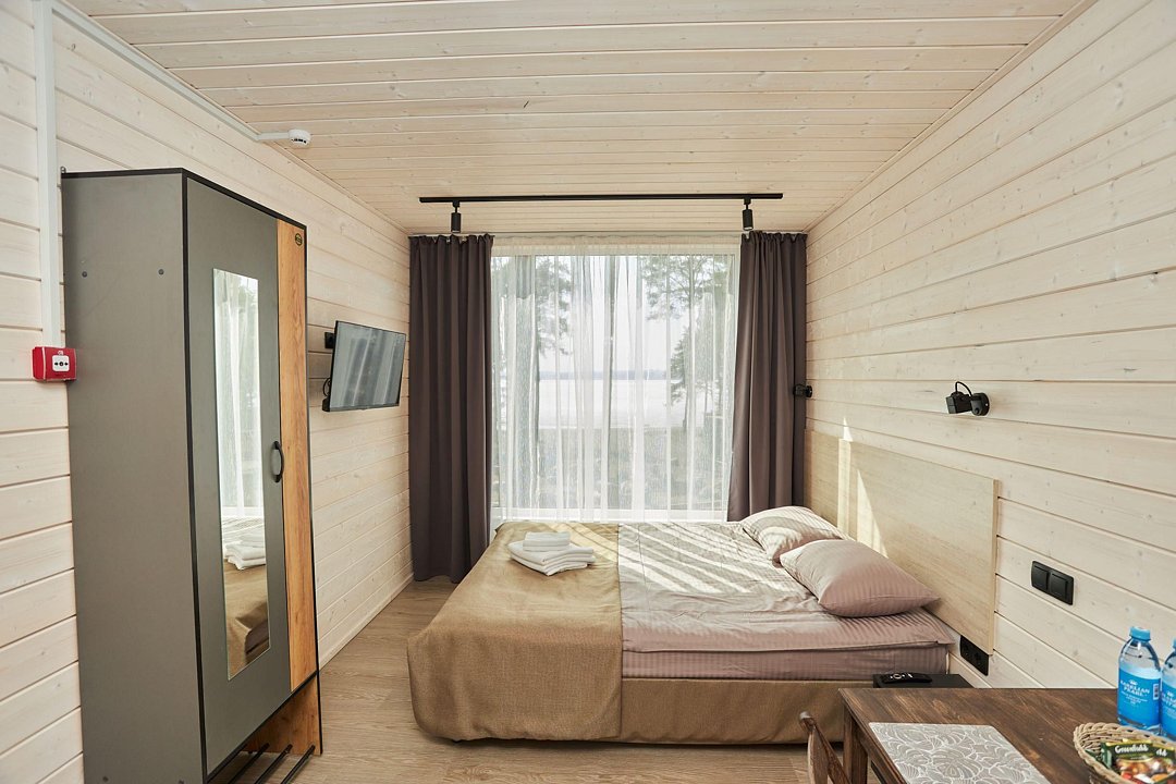 Комфортный гостевой домик для двоих 18 м², с панорамным видом на Онежское озеро и сосны. Домик на второй береговой линии, до 150 метров от берега. Находится рядом с рестораном.