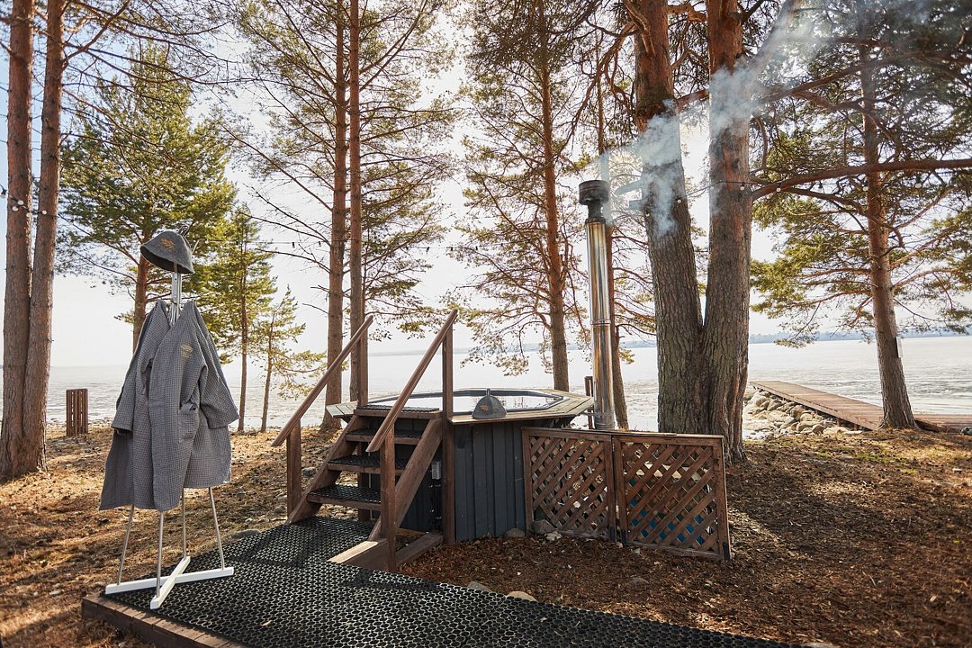На берегу Онежского озера, рядом с баней, находится купель, в которой могут разместиться до шести человек. Вода в ней подогревается, что создает идеальные условия для отдыха на природе.