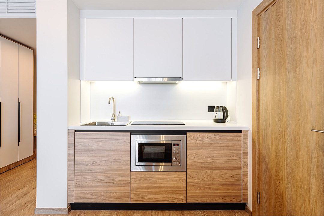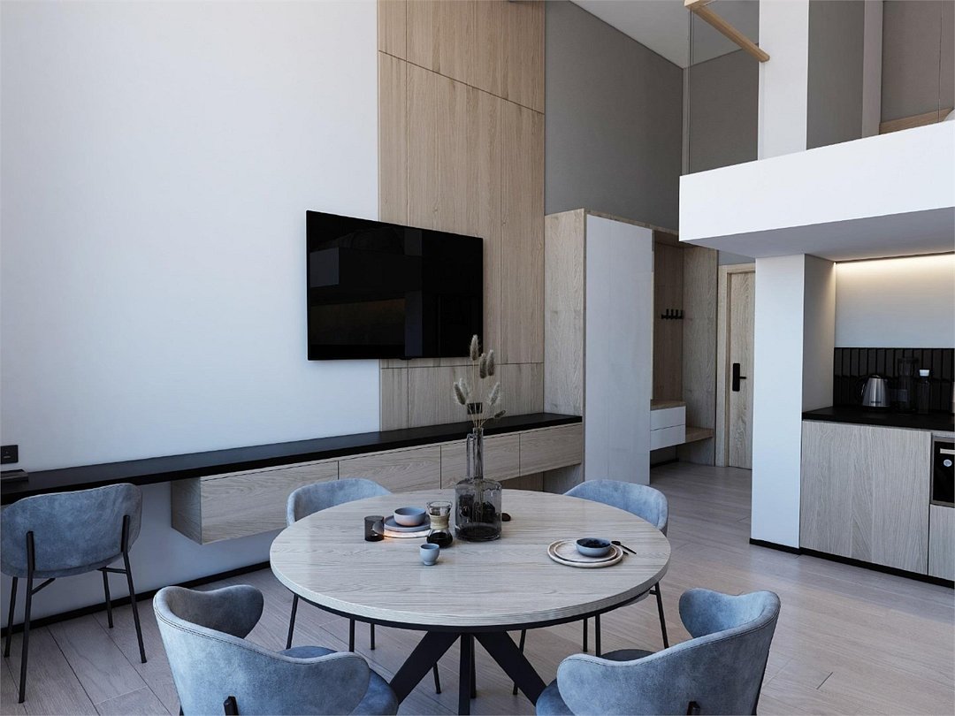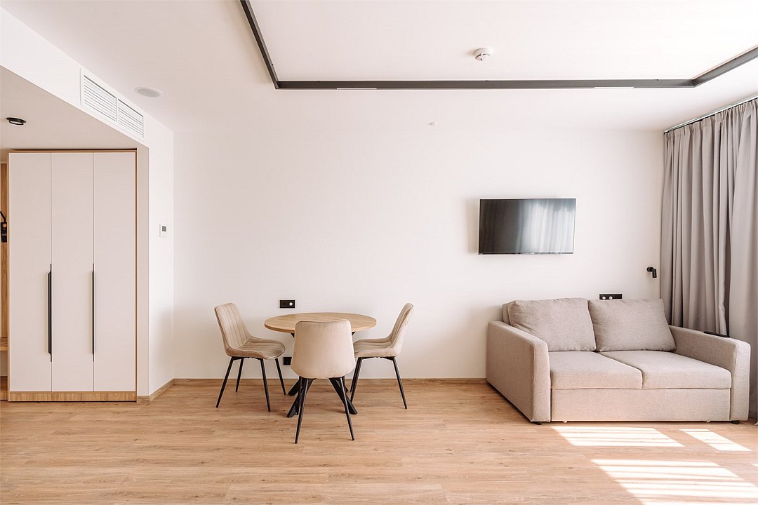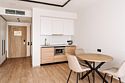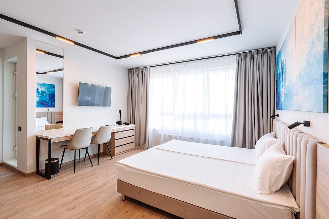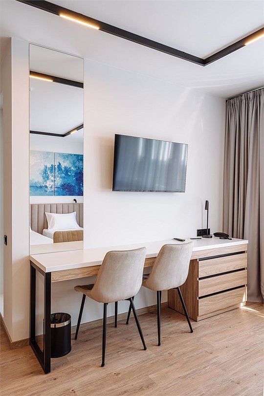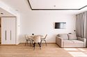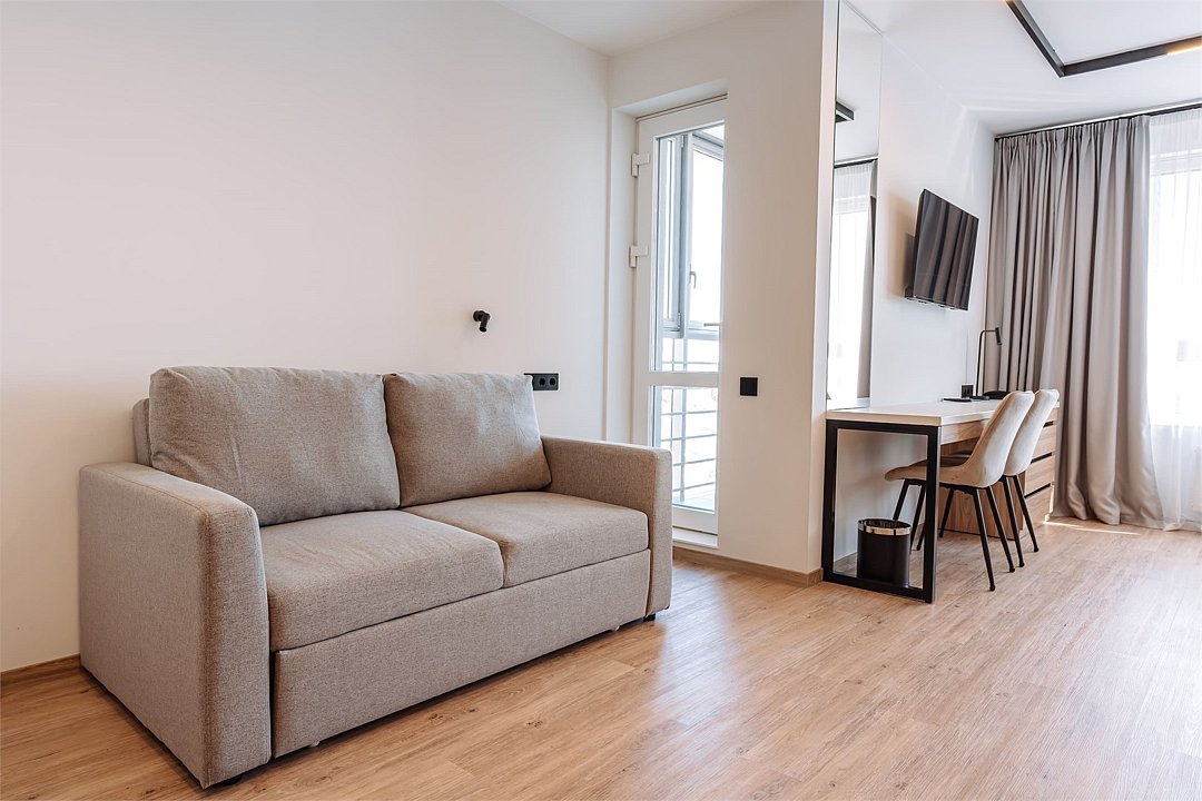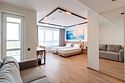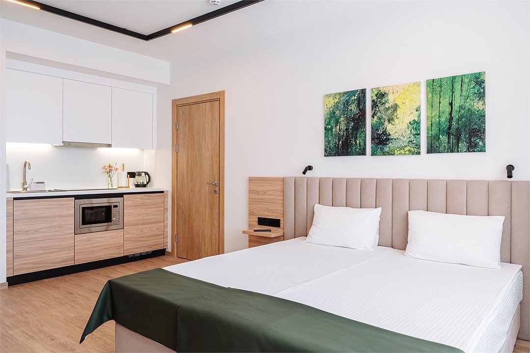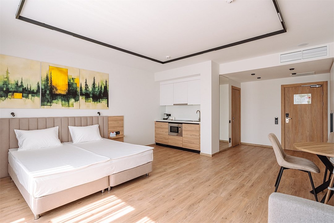 Уютные однокомнатные Апартаменты Студия. В апартаментах есть все для комфортного проживания: полноценная кухня, модульные кровати (твин/дабл), вместительный шкаф, гладильная доска с утюгом, большая ТВ-панель, кондиционер, рабочая зона, бесплатный Wi-Fi, индивидуальный сейф. В ванной комнате - душевая зона, большое зеркало с подсветкой и феном, тёплые полы. Для гостей апартаментов подготовлены косметические средства и тапочки.Услуги и удобства