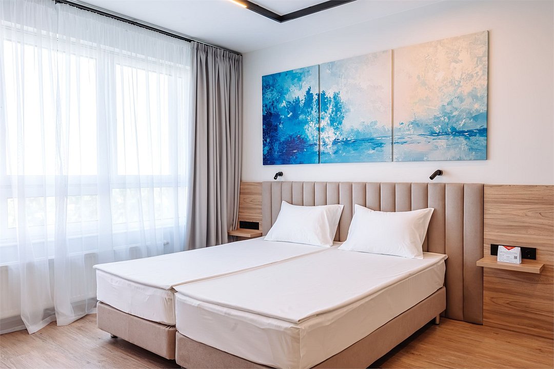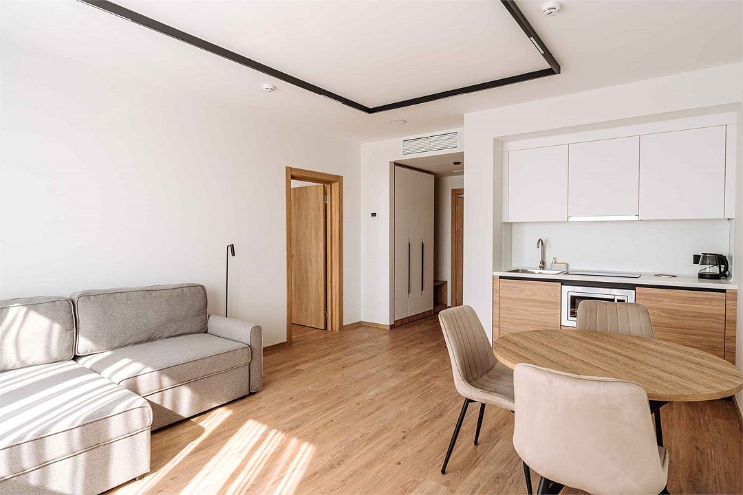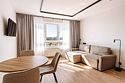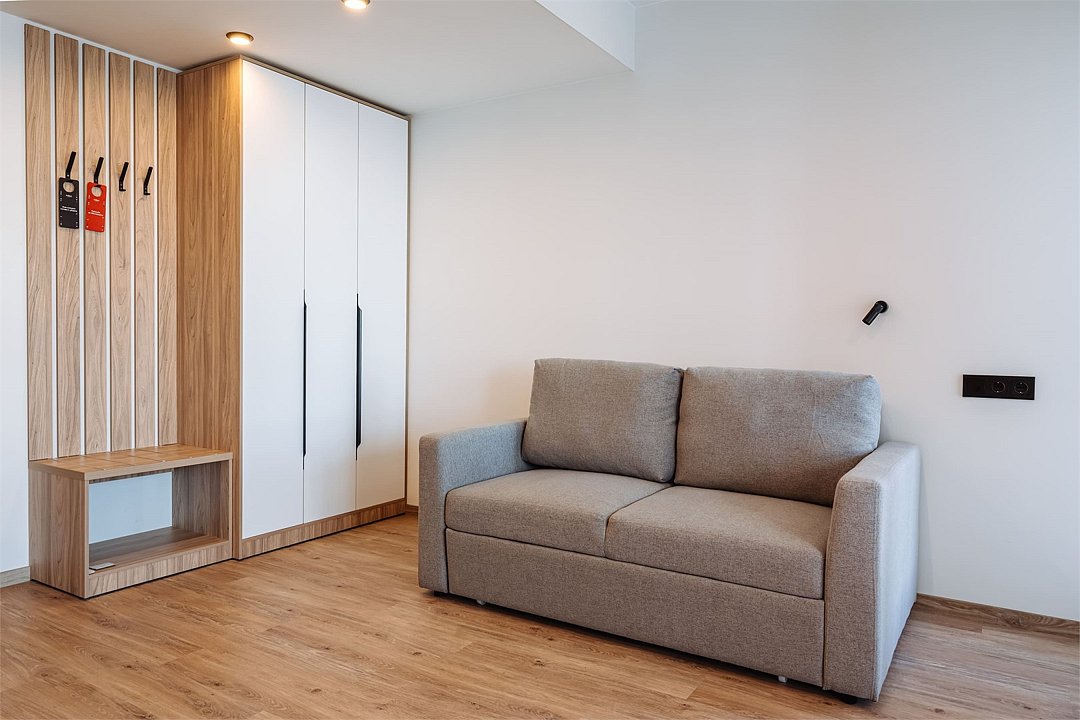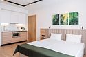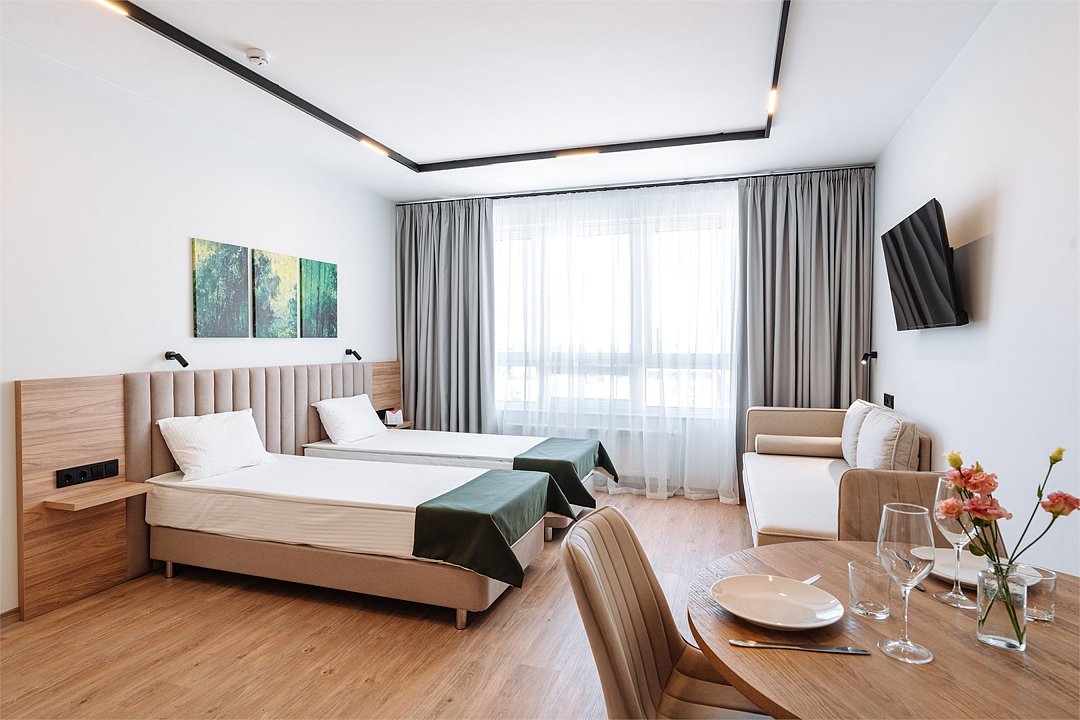 Просторные однокомнатные Апартаменты для гостей, которые ценят удобство и комфорт. В апартаментах есть все для комфортного проживания: полноценная кухня, модульные кровати (твин/дабл), вместительный шкаф, раскладной диван, гладильная доска с утюгом, большая ТВ-панель, кондиционер, бесплатный Wi-Fi, индивидуальный сейф. В ванной комнате - душевая зона, большое зеркало с подсветкой и феном. Для гостей апартаментов подготовлены косметические средства, халаты и тапочки.Услуги и удобства