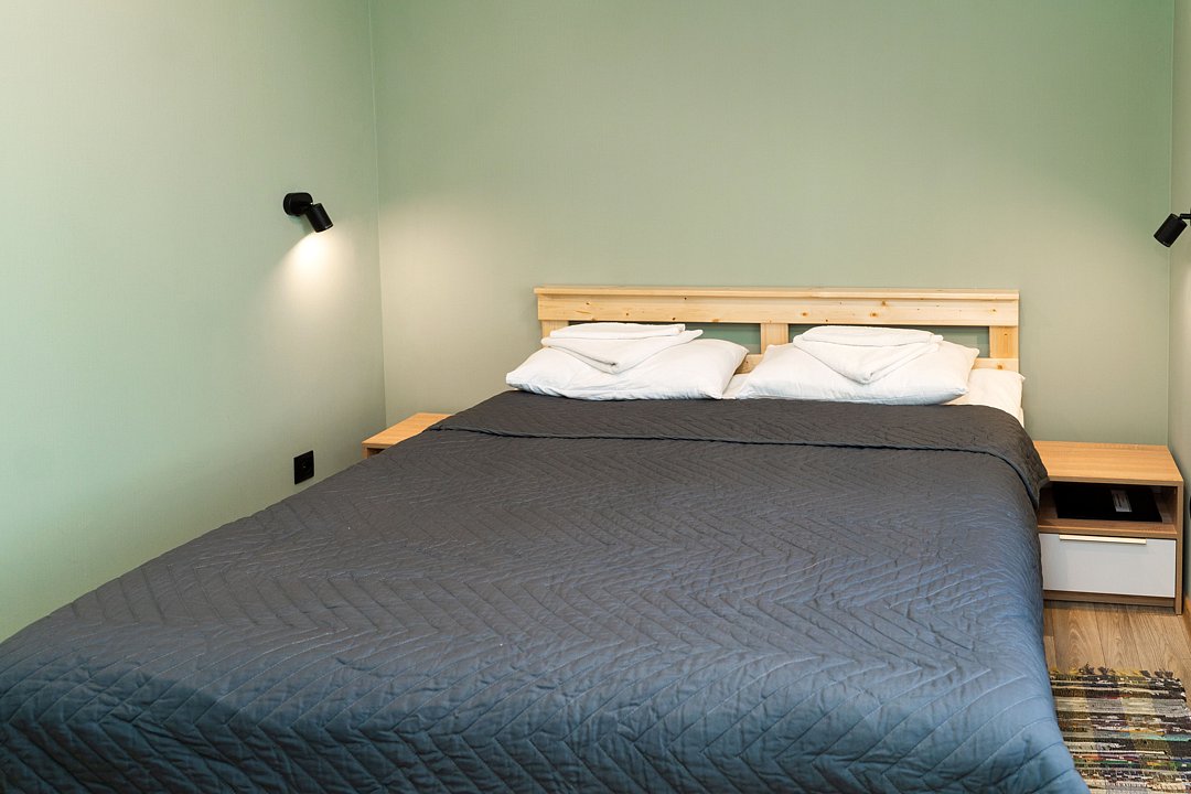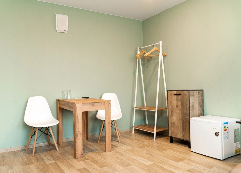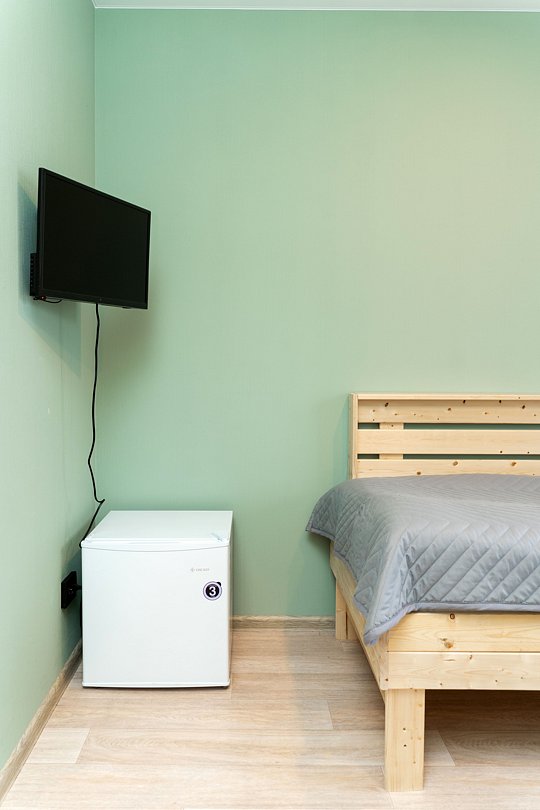 Оснащение — одна двуспальная кровать, прикроватная тумбочка, телевизор, холодильник столик, стул. Предоставляются полотенца, постельное белье.