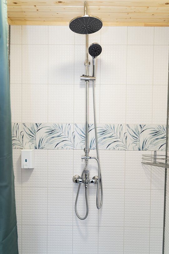 Двухместный номер с двуспальной кроватью, душ и туалет находятся в номере.