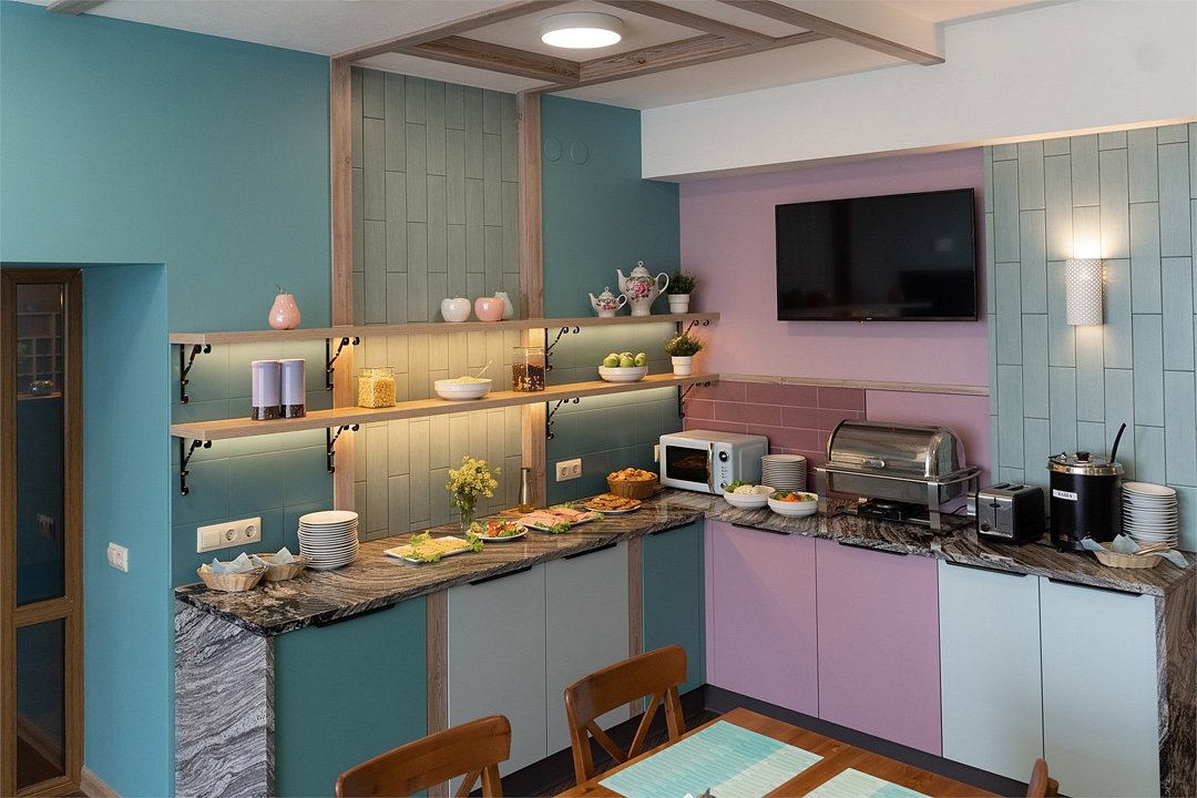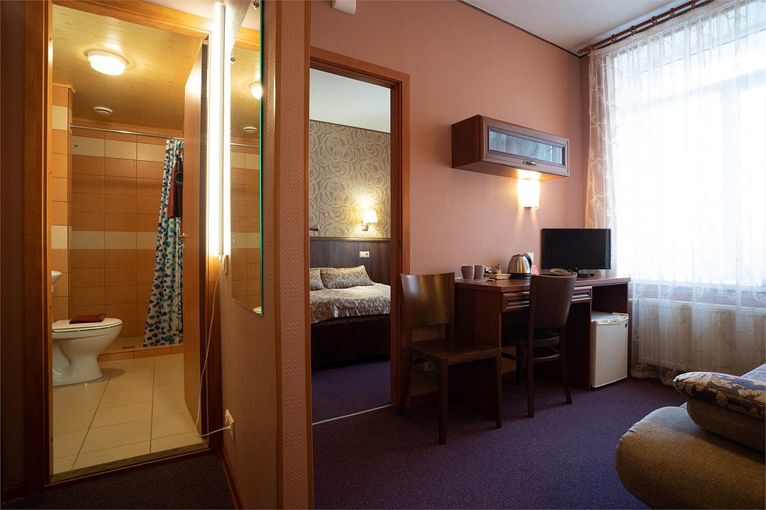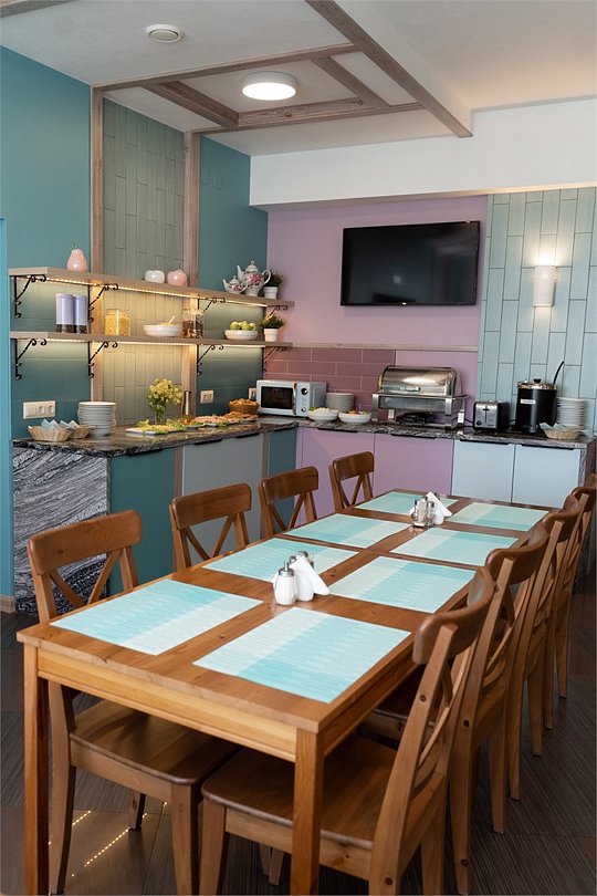 Короткий отпуск с друзьямиМилое местечкоОстанавливались в этой гостинице на одну ночь во время турпоездки. Гостиница очень понравилась, чистенький номер с двуспальной кроватью в одной комнате и с диванчиком во второй. Постельное белье хорошего качества, чистое, матрац приличный, неудобств не испытывали. Имеются холодильник, чайник, кружки, на рецепшн можно купить заварку в пакетике, а поскольку мы приехали поздно вечером, то все это было очень кстати. На этажах стоят кулеры с водой. В наличии одноразовое мыло, шампунь, полотенца веселенького оранжевого цвета. Отдельное спасибо за завтрак- большой выбор, все очень вкусное, домашнее. Гостей достаточное количество, но суеты и неразберихи нет, все организовано, сотрудница на рецепшн доброжелательная и внимательная. Утром заметили, что фасад здания радует глаз цветным оформлением. Итог-внешнее оформление соответствует внутреннему наполнению: уютно, вкусно, хочется и самим сюда вернуться и порекомендовать эту гостиницу другим путешественникам.