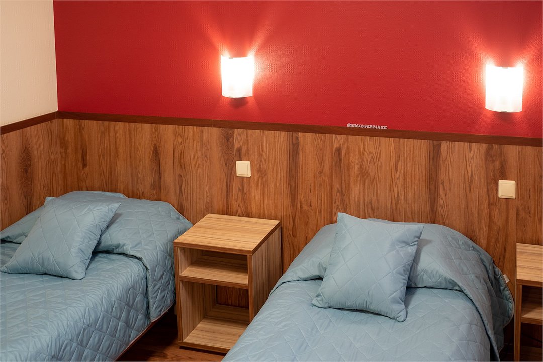 телевизор, Wi-Fi, телефон, светильник, фен, санузел, теплый пол, банные полотенца, гигиенические средства, две односпальные кровати, тумбы, стулья, шкаф для одежды, вешалки, зеркало, чайник, ковровое покрытие, отопление, душ, кулер на этаже, вид во двор, стол, туалет, мини-холодильник, москитная сетка, пуфик, уборка номера, услуги прачечной (платно), шапочка для душа, мыло, можно с питомцамиВ гостиничном номере