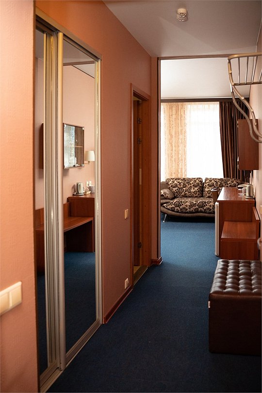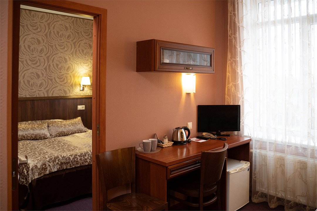 телевизор, Wi-Fi, телефон, светильник, фен, обогреватель, санузел, теплый пол, халаты, банные полотенца, тапочки, гигиенические средства, двуспальная кровать, тумбы, стулья, шкаф для одежды, вешалки, письменный стол, зеркало, две комнаты, чайный набор, набор посуды, чайник, ковровое покрытие, отопление, душ, кулер на этаже, стаканы, туалет, диван-кровать, раскладной диван, мини-холодильник, москитная сетка, межкомнатная дверь, уборка номера, набор для приготовления чая и кофе, услуги прачечной (платно), вешалки-плечики, шапочка для душа, мыло, без питомцевВ гостиничном номере