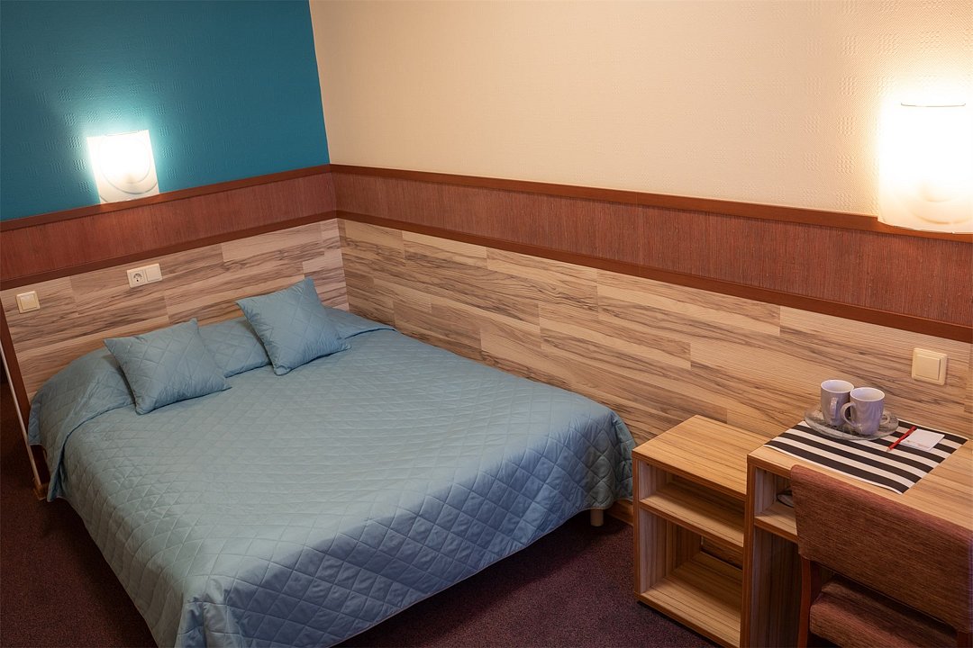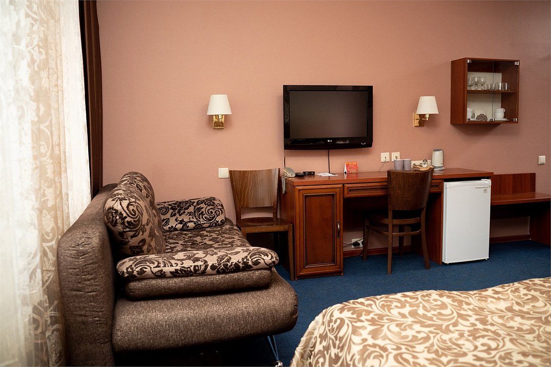 телевизор, Wi-Fi, телефон, светильник, фен, обогреватель, санузел, теплый пол, банные полотенца, двуспальная кровать, тумбы, стулья, шкаф для одежды, вешалки, письменный стол, зеркало, чайник, ковровое покрытие, отопление, душ, кулер на этаже, вид во двор, туалет, мини-холодильник, москитная сетка, пуфик, уборка номера, услуги прачечной (платно), шапочка для душа, мыло, можно с питомцамиВ гостиничном номере