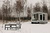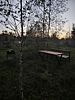 У каждого домика есть отдельная зона барбекю: стол, лавка, мангал.