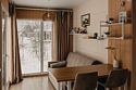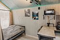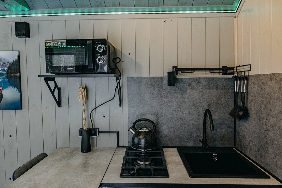 В домике есть всё необходимое для проживания: двуспальная кровать, двуспальный диван, мини-кухня с посудой, плитой, кухонной утварью, холодильником, микроволновкой, чайным набором.