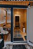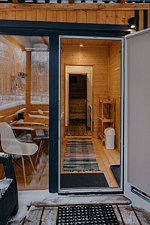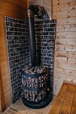 В зоне отдыха — стол на 4 гостя, радио, на веранде - 2 кресла. В бане имеется душ, раковина, ведро для обливания ледяной водой. В парной — панно из можжевельника, аромамасла, ковши для подачи жара, песочные часы и термометр, вешалки, подголовник.