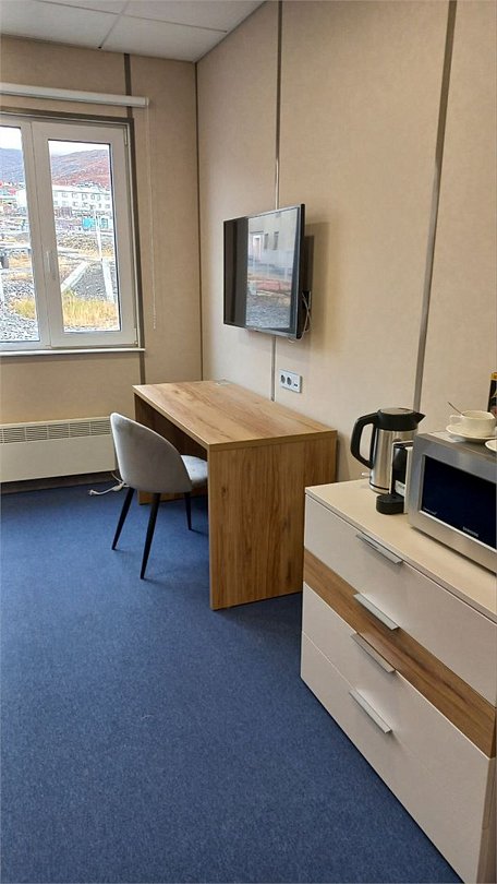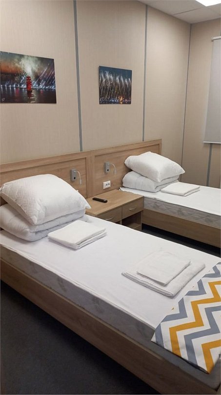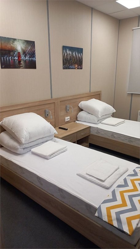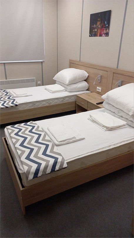 Wi-Fi, интернет, телефон, светильник, микроволновая печь, две односпальные кровати, тумбы, стулья, шкаф для одежды, вешалки, чайник, унитаз, раковина, душ, общая ванная комната, стаканы, туалетный столик, стол, тумба, туалетный столик, туалетные средства, санузел на этаже, туалет, телевизор с плоским экраном, мини-холодильник, душ на этажеВ номере