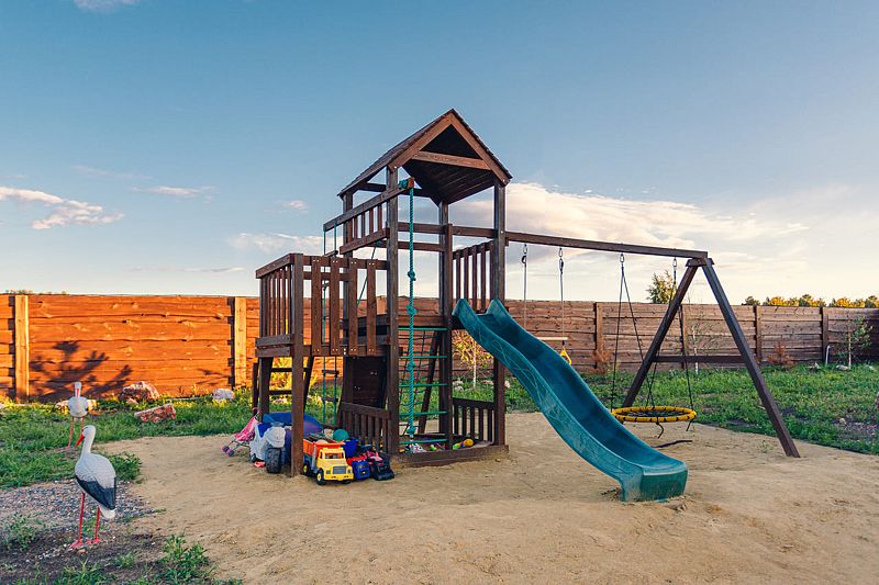 Детям точно понравится играть на безопасной детской площадке с горками.