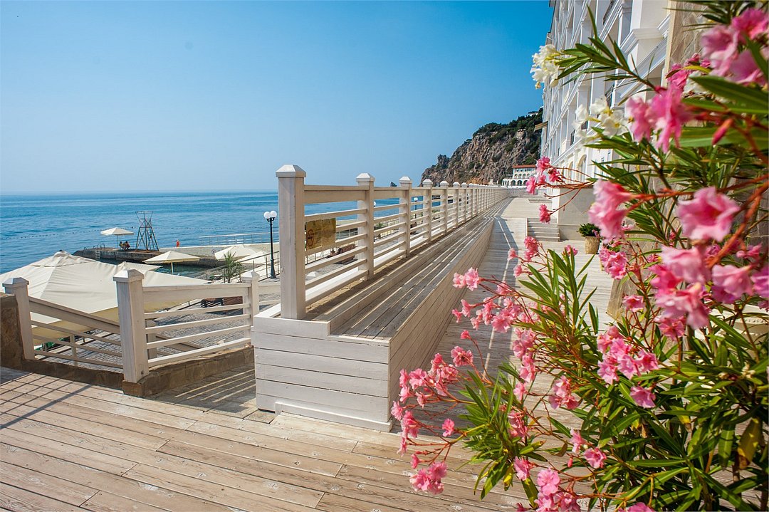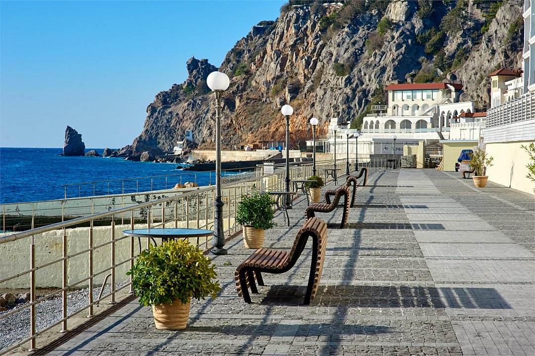 • Оборудованный галечный пляж с видом на гору Аю-Даг и прогулочной набережной.