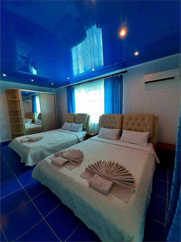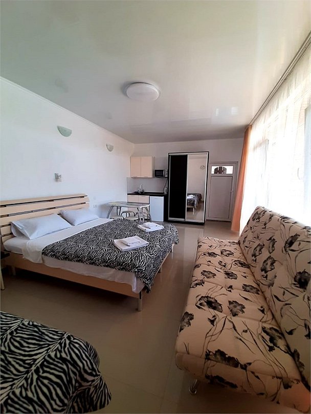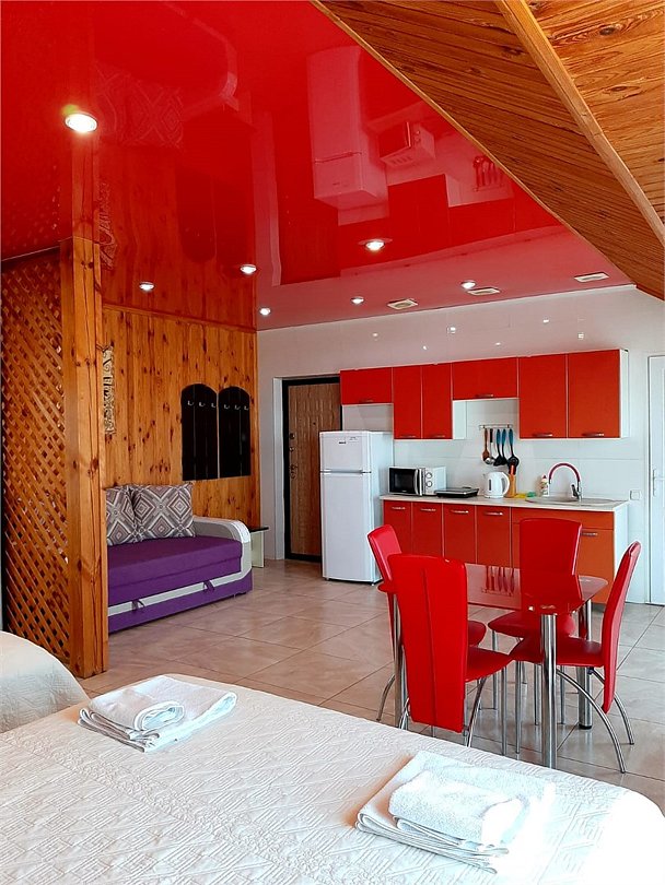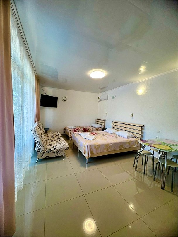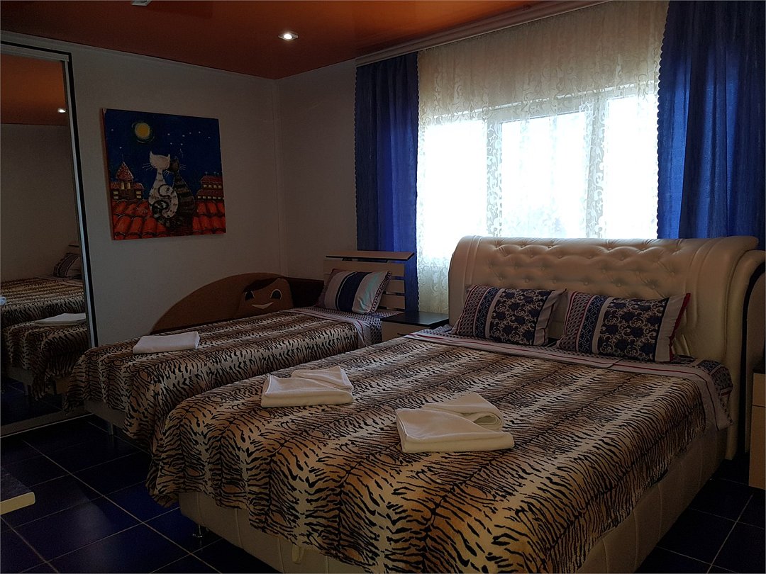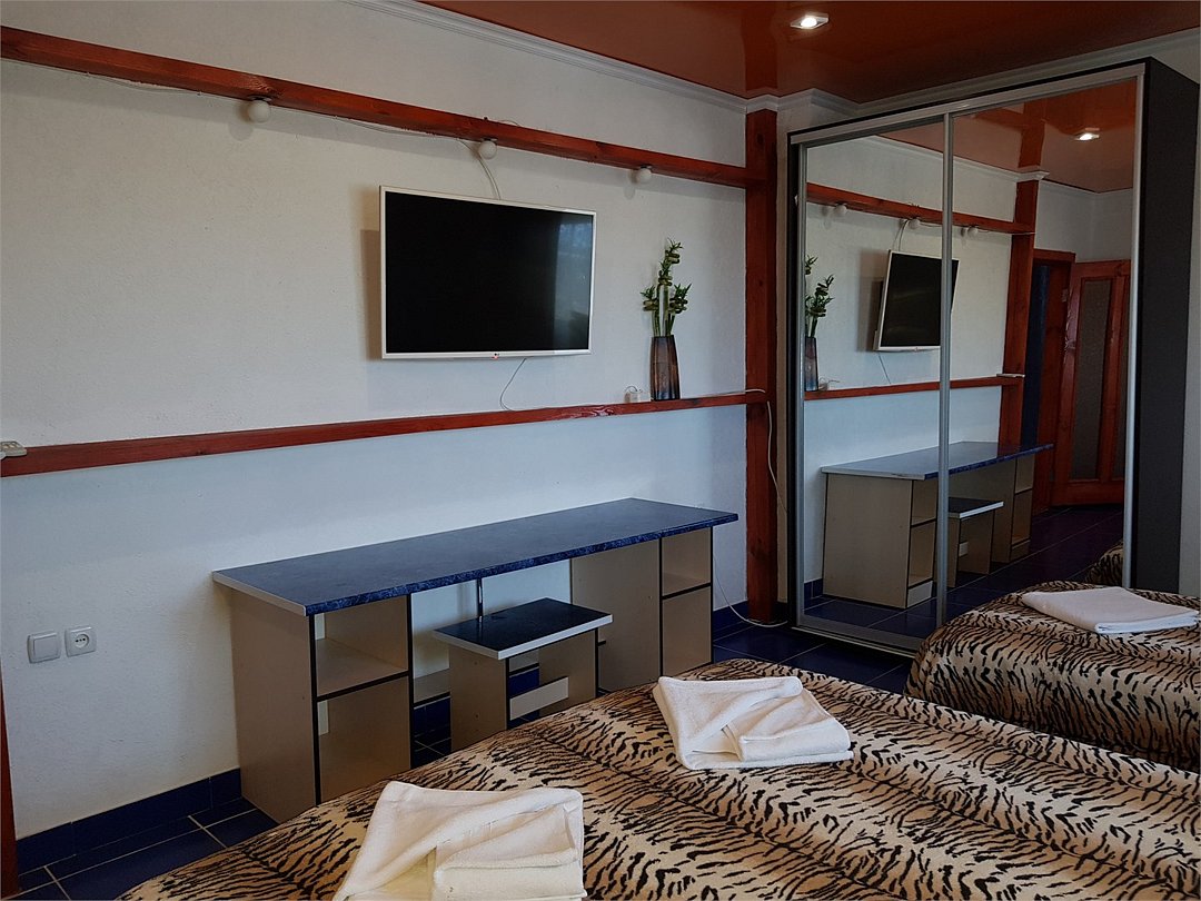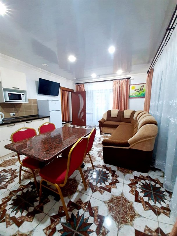 В каждом номере есть кухня с набором посуды, эл. печка, микроволновка, телевизор, кондиционер, душ и ванна в одном из номеров, полотенца по 3 шт на чел, санузел укомплектован - фен, жидкое мыло. По желанию предоставляем детскую кроватку, стульчик для кормления. Возле номеров широкая терасса , стол, стулья, сушилка для белья. Балкон дополнительно есть в номере на 3 этаже.Услуги и удобства