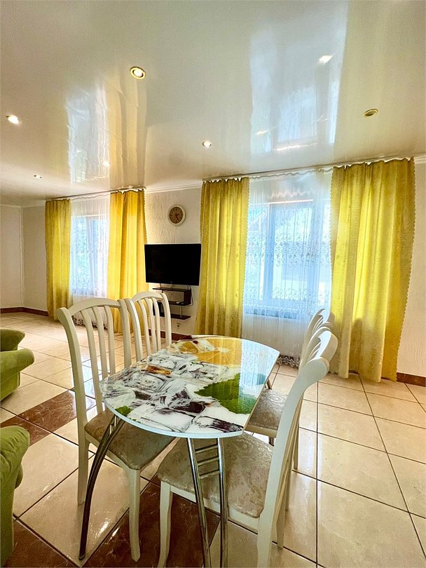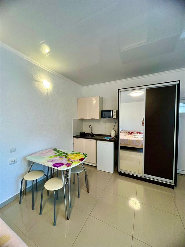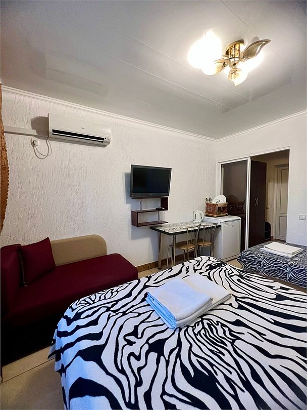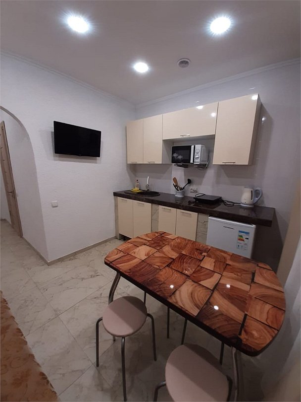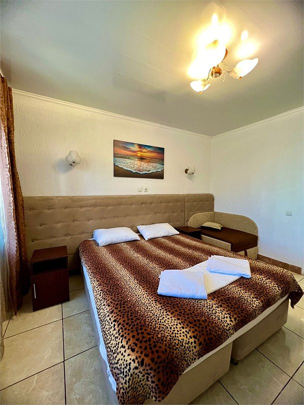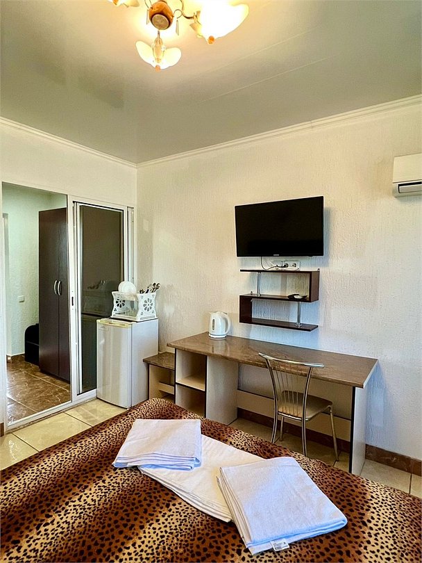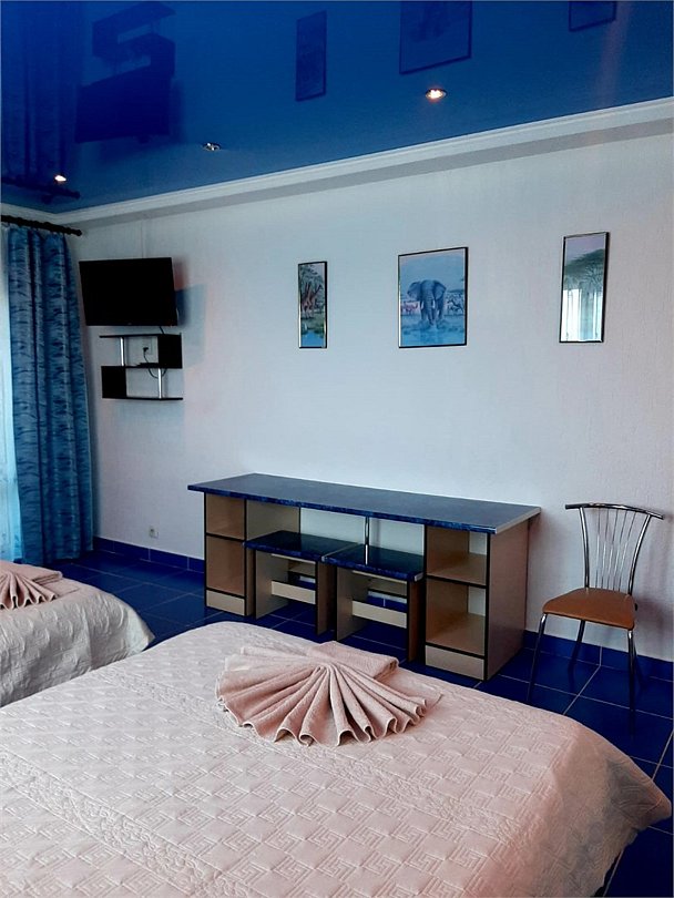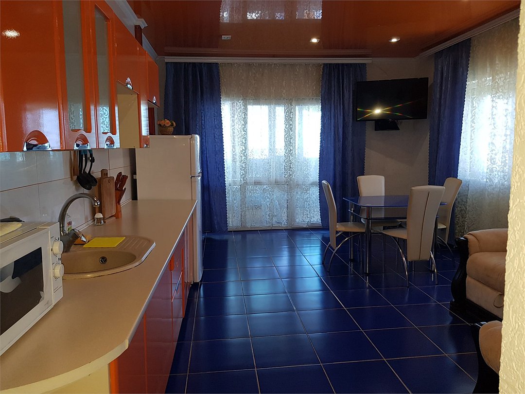В каждом номере есть кухня с набором посуды, эл. печка, микроволновка, телевизор, кондиционер, душ и ванна в одном из номеров, полотенца по 3 шт на чел, санузел укомплектован - фен, жидкое мыло. По желанию предоставляем детскую кроватку, стульчик для кормления. Возле номеров широкая терасса , стол, стулья, сушилка для белья. Балкон дополнительно есть в номере на 3 этаже.Услуги и удобства
