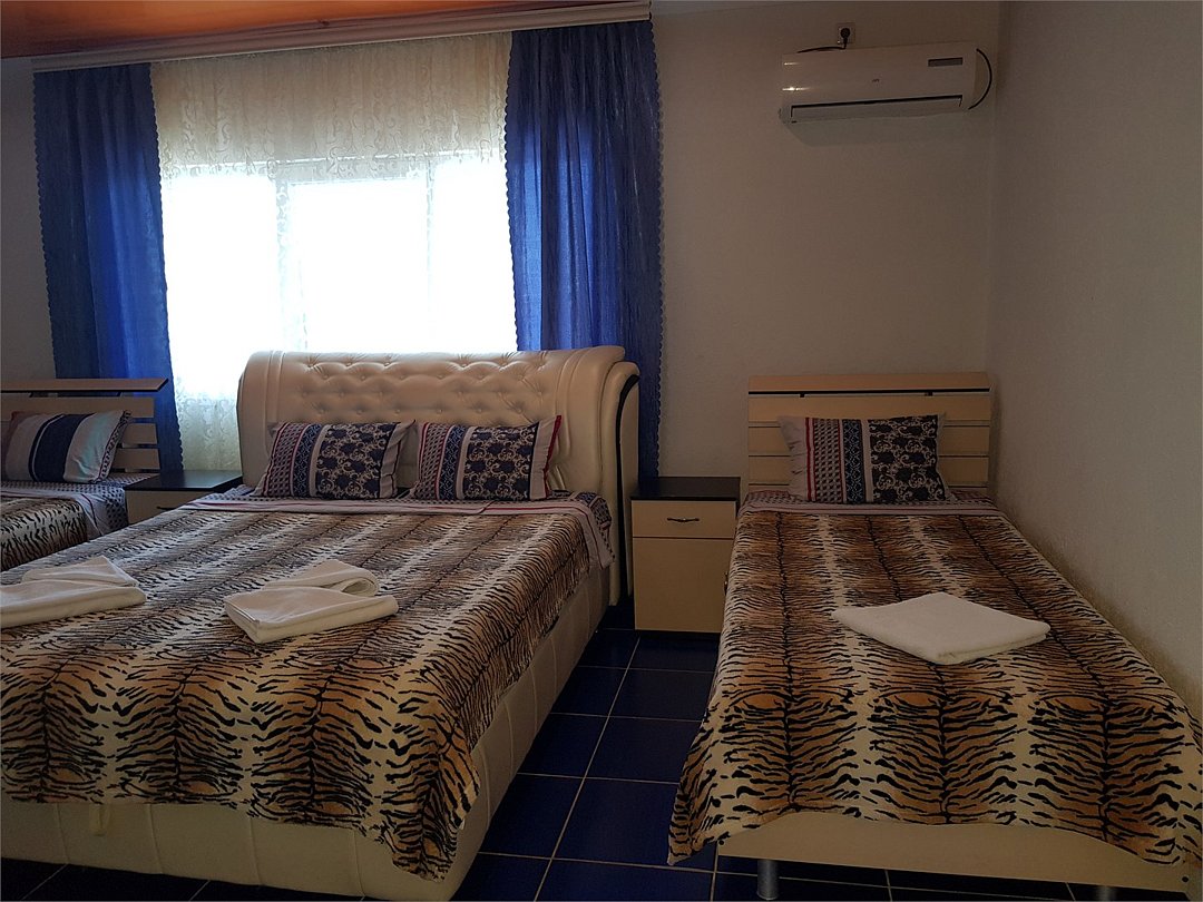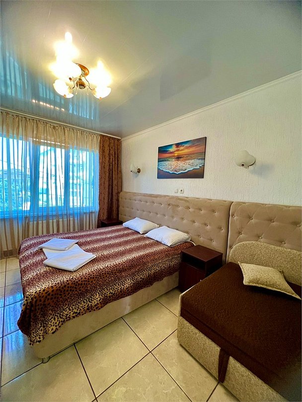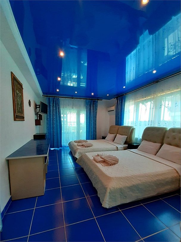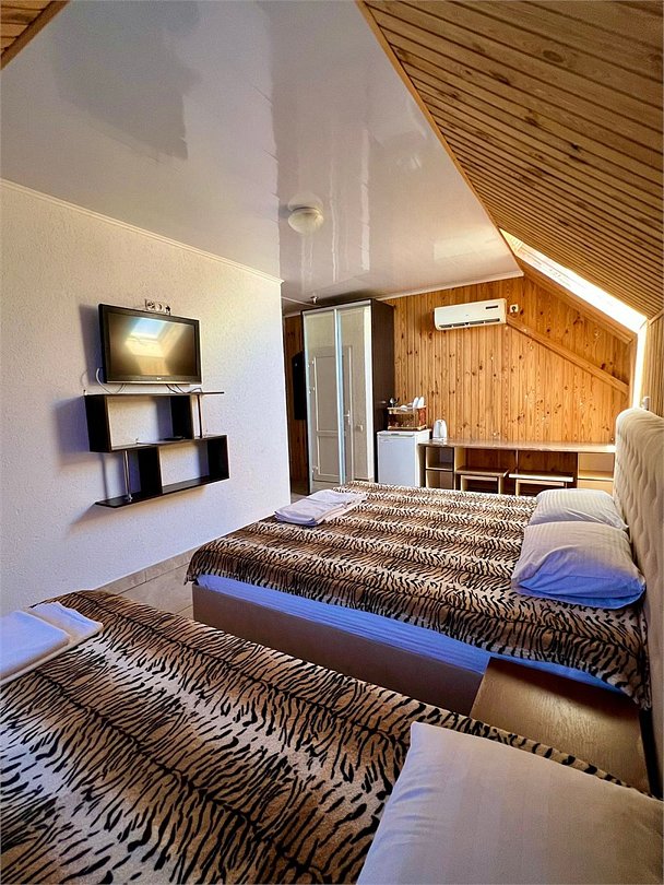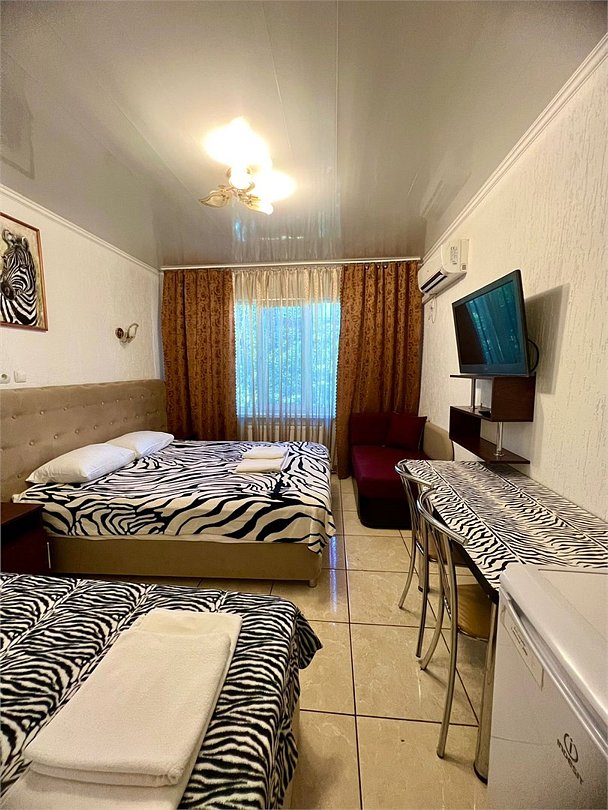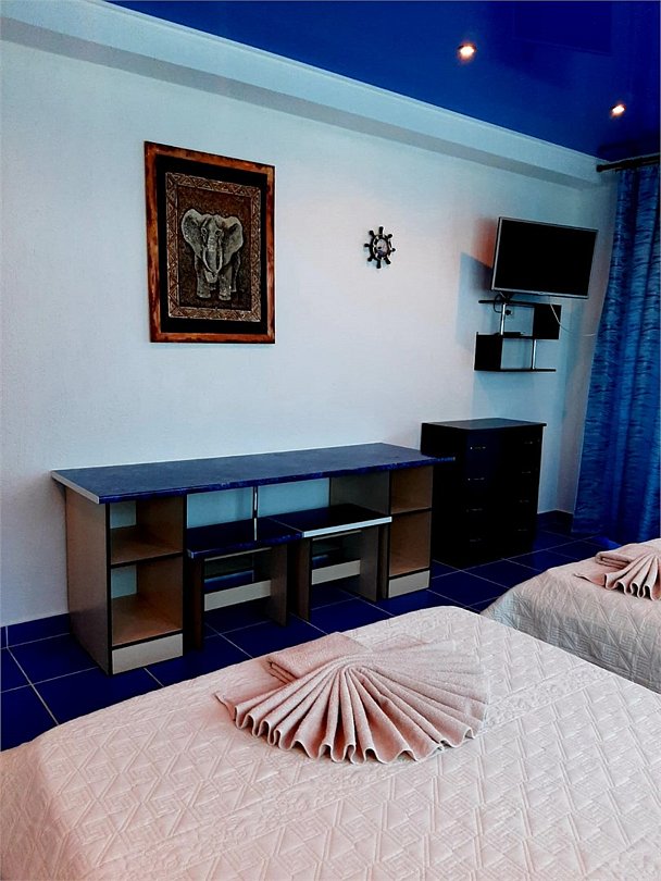 2х комнатный номер 3+3 местный с большой лоджией и кухней. комнаты имеют два отдельных входа и один санузел. Кужня оборудована всем необходимым для готовки, так-же, холодильник, в каждой комнате телевизоры и кондиционеры. Большая лоджия застеклена, обезшумлена, при желании может постужить спальным местом. Номер находиться на 2 этаже.Услуги и удобства