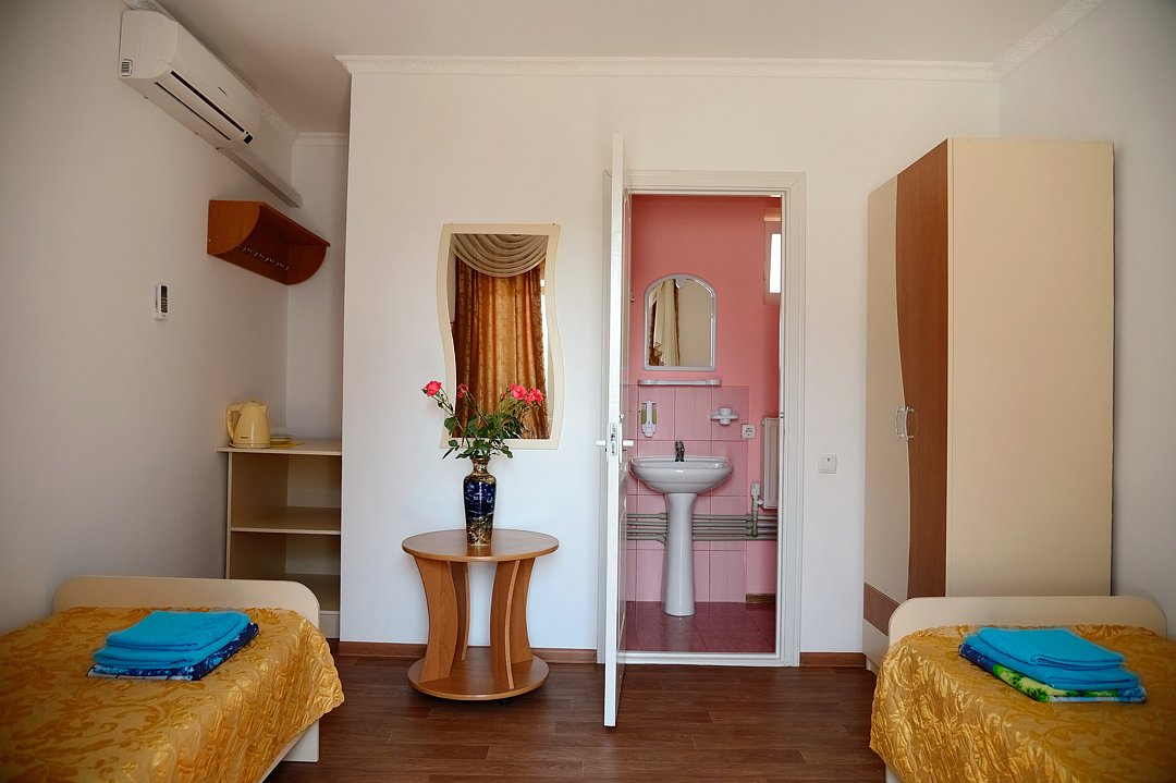 Пансионат расположился на благоустроенной озелененной территории в 850 метрах от моря. В распоряжении гостей небольшие уютные номера, в каждом имеется собственный санузел с душем, телевизор и электрочайник. Среди удобств – общий холодильник на этаже и безлимитный интернет.