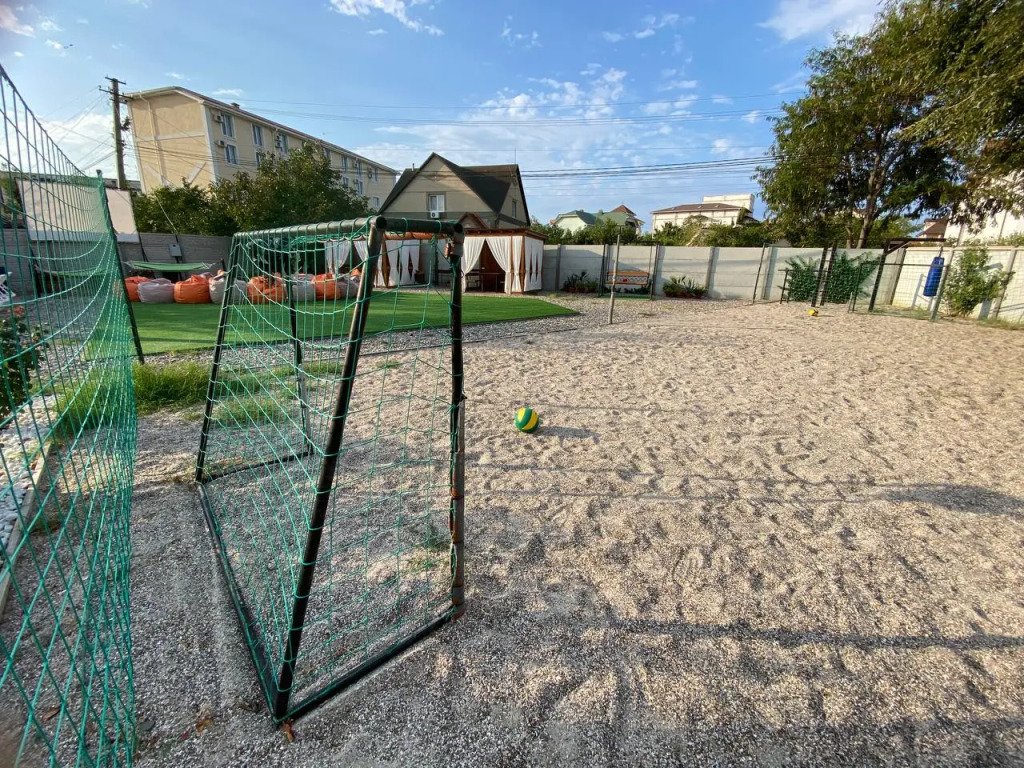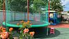 Детская зона включает батут, игровой лабиринт, спортивные площадки, кресла-мешки и открытую лужайку.