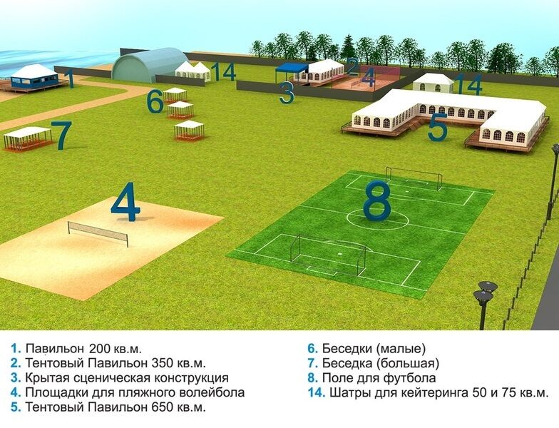 Для любителей активного вида отдыха есть волейбольное и футбольная поле, где можно состязаться в командной игре семьями или компанией. А остальные гости базы отдыха могут болеть за команды и поддерживать их, как болельщики на стадионе. Любители водных развлечений могут взять в прокатном в аренду катамараны и гидроциклы.