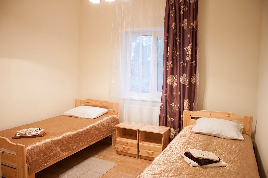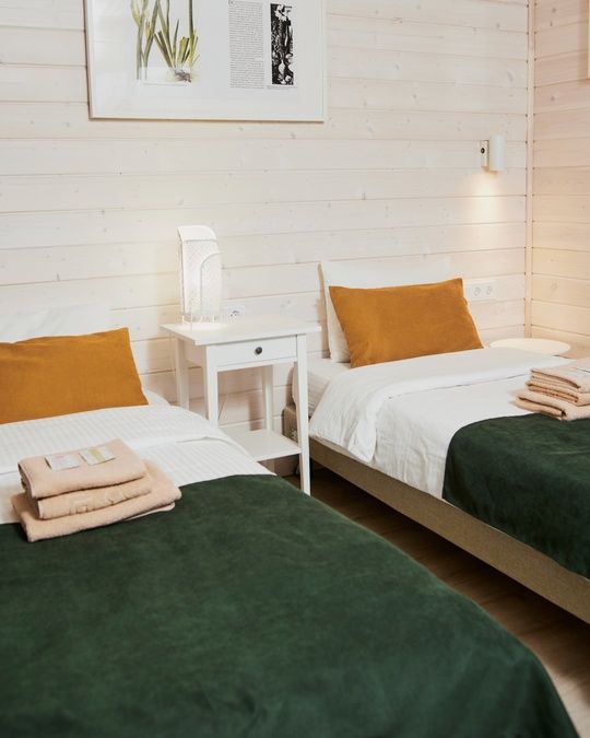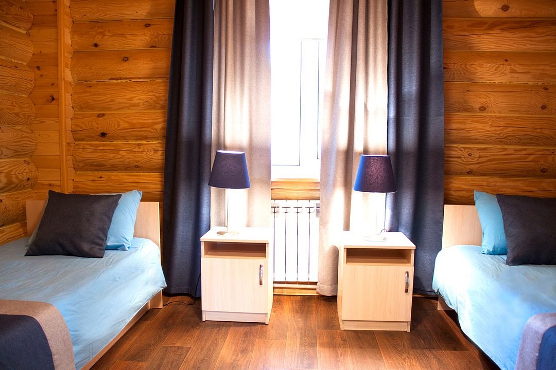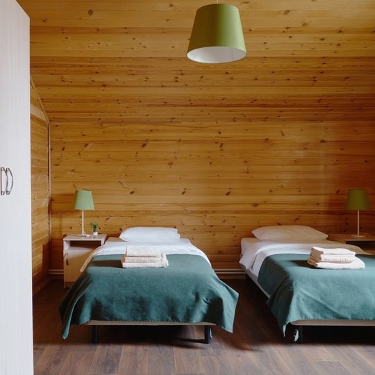 В комфортабельном номере категории Стандарт в коттедже вас ждут две односпальные кровати, идеально подходящие для дружеского или семейного отдыха. Номер оснащен собственным санузлом с душем, холодильником для удобства хранения продуктов, телевизором для приятного досуга и феном для вашей комфортной укладки.