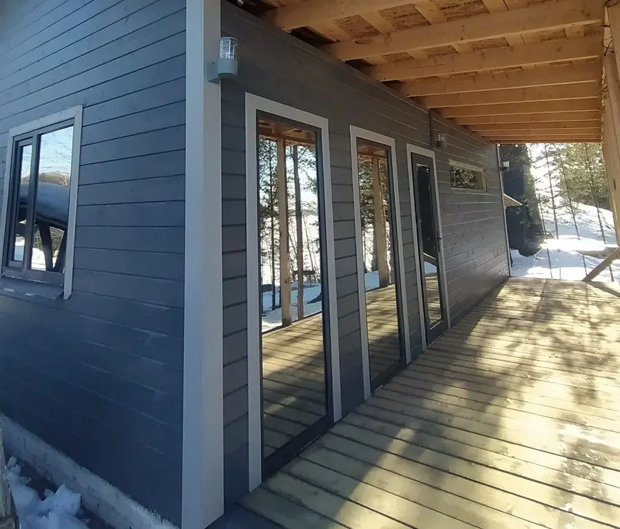 Шикарная баня на берегу. Большая терраса с креслами, большая комната отдыха, душ, парная с видом на озеро, после парилки можно окунуться в озеро, для этого оборудован специальный спуск на пирсе.
