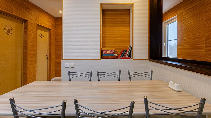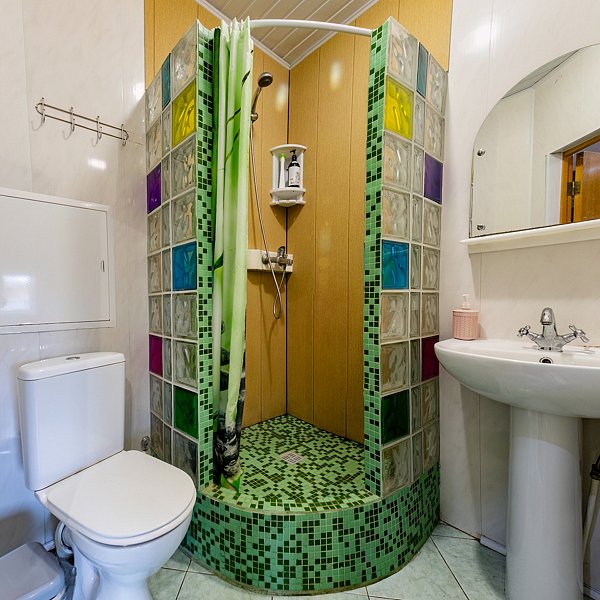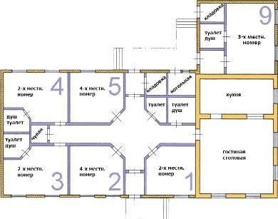 Большой дом. Состоит из 6-ти спален. Вмещает 17 человек, не считая 2-х дополнительных мест. В доме есть номера бюджетного типа с удобствами на этаже, а также номера с душем, туалетом, холодильником и телевизором.
