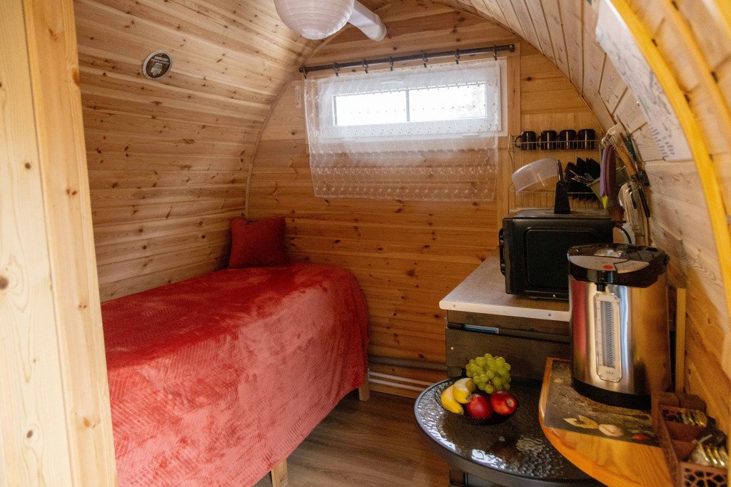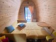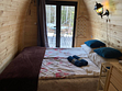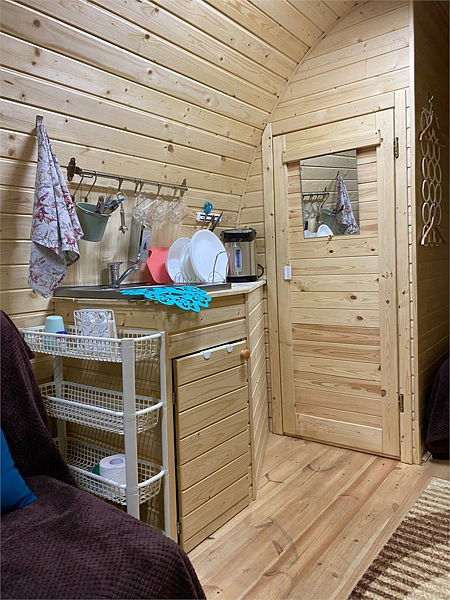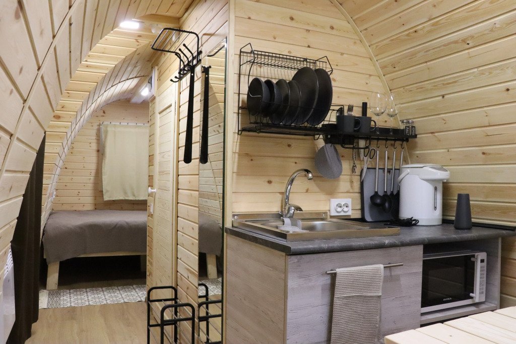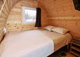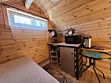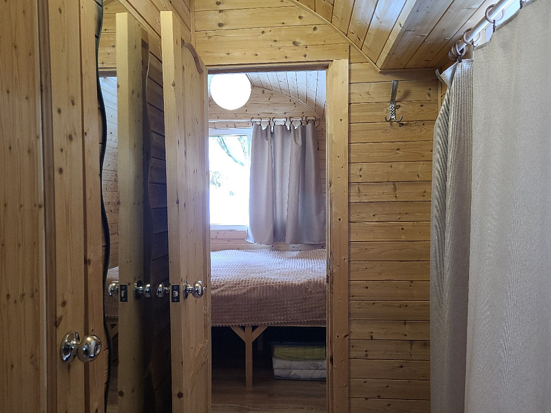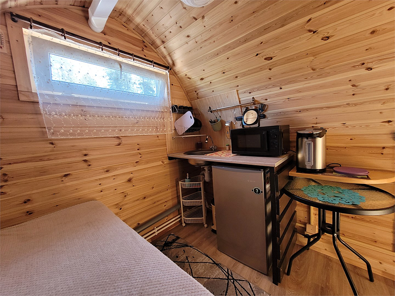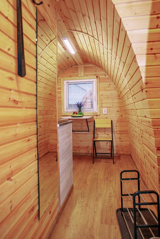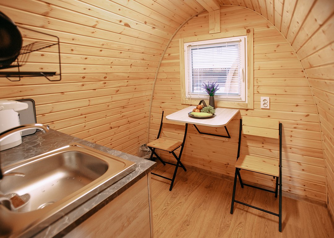 Небольшой арочный домик расположен зеркально с аналогичным домиком и имеет с ним общую террасу и мангал. Домик предназначен для размещения до 4-х человек и идеально подходит для размещения семьи с небольшими детьми (2 человека могут расположиться в отдельной комнате с двуспальной кроватью (1400*2000), 2 дополнительных места в виде выдвижной кровати (1400*2000) оборудованы в зоне кухни.