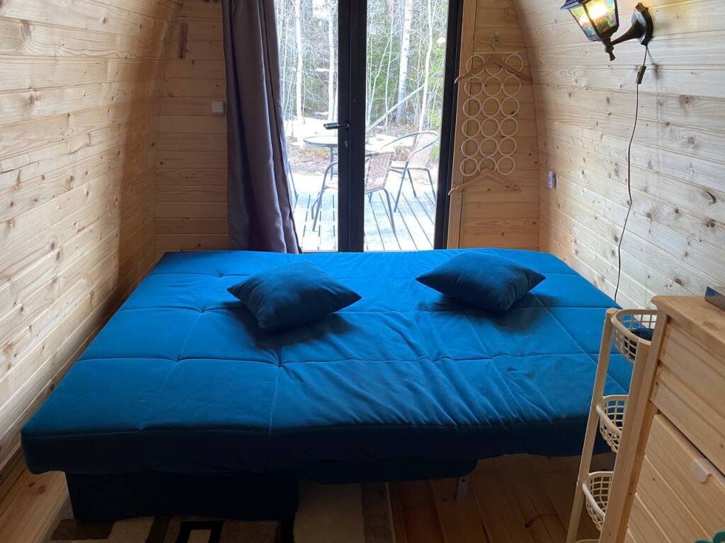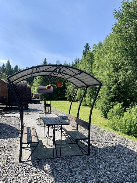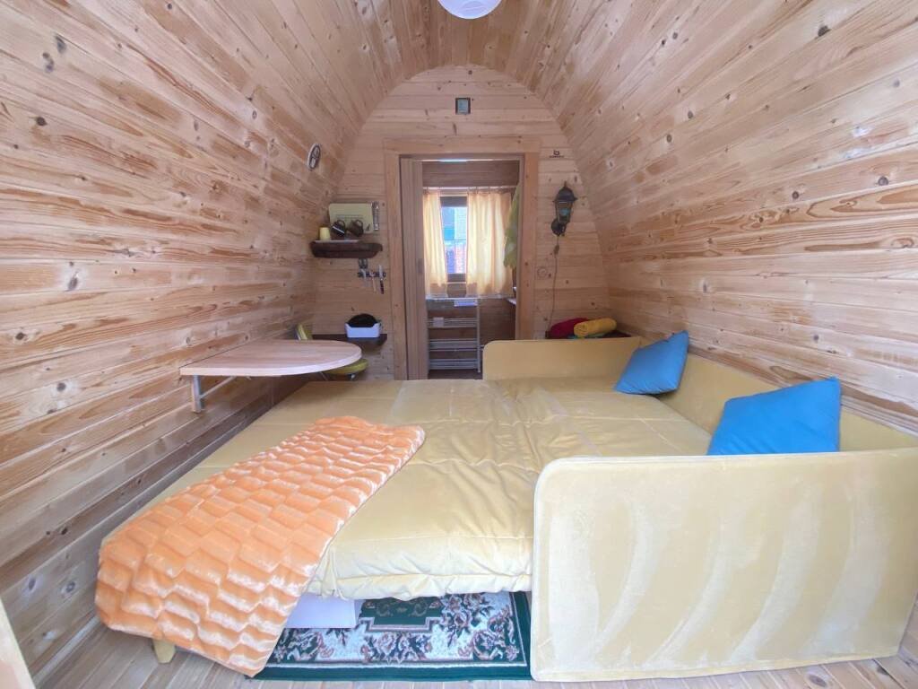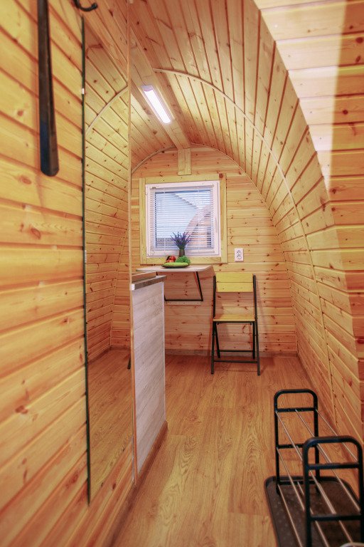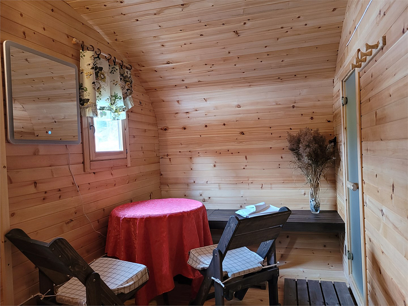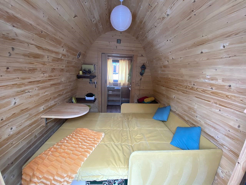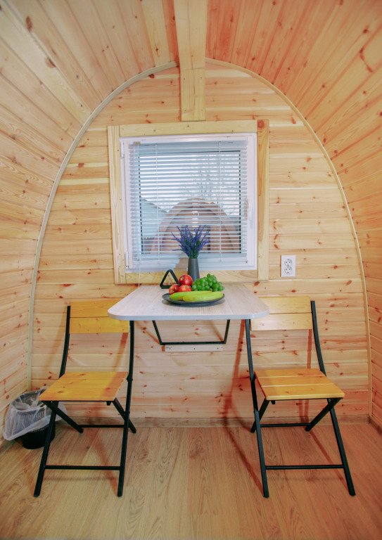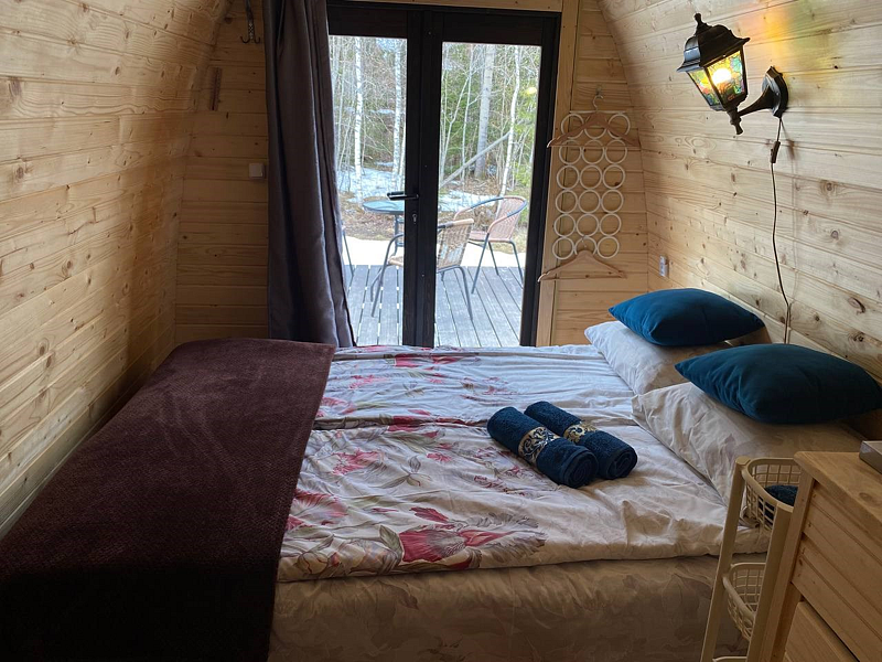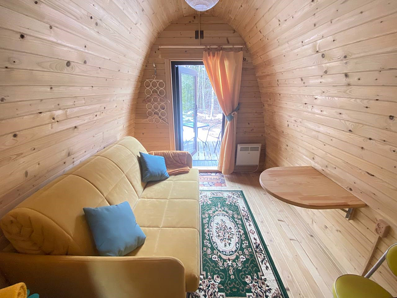 Небольшой арочный домик для отдыха с видом на лесной массив и отдельной террасой готов принять гостей по системе 1+1 (2 человека могут расположиться на удобном двуспальном диване (1400*2000) и использоваться как дополнительные спальные места при бронировании 3-х местного или 4-х местного домика.