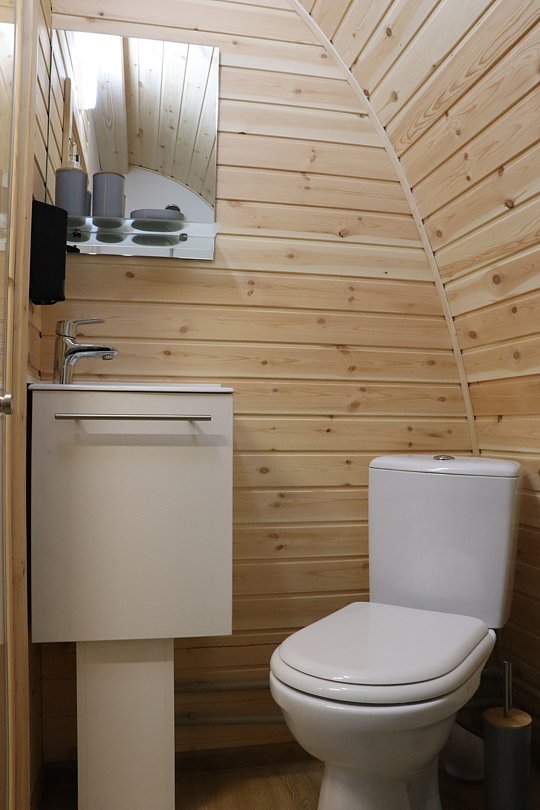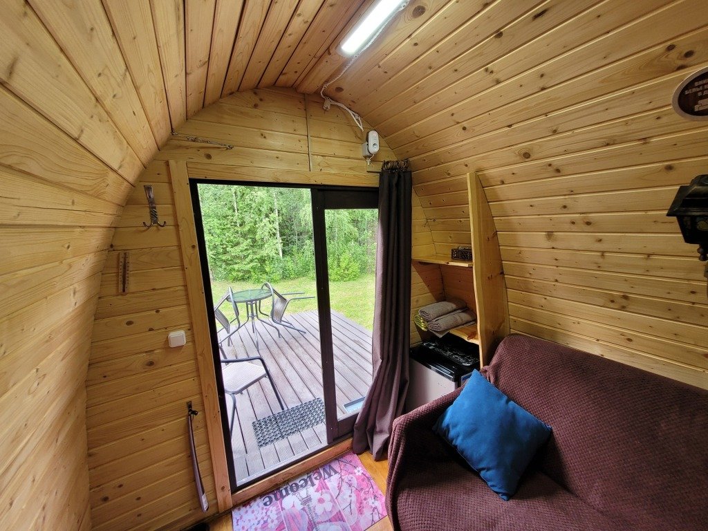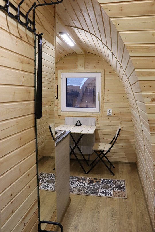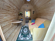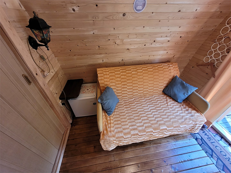 Небольшой арочный домик для отдыха с видом на лесной массив и отдельной террасой готов принять гостей по системе 2+1 (2 человека могут расположиться на удобном двуспальном диване (1400*2000) + 1 дополнительное место в виде односпальной кровати (900*2000). Несмотря на небольшую площадь, всего 15 м2, домик максимально полно и компактно оборудован всем необходимым для комфортного отдыха.