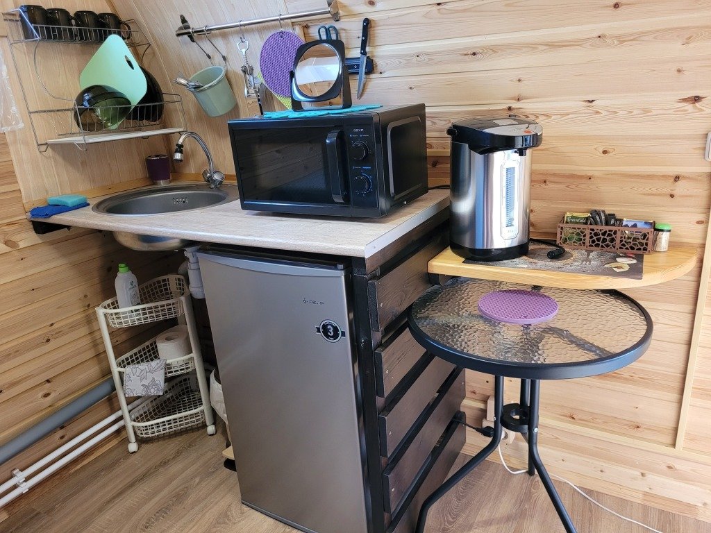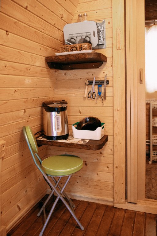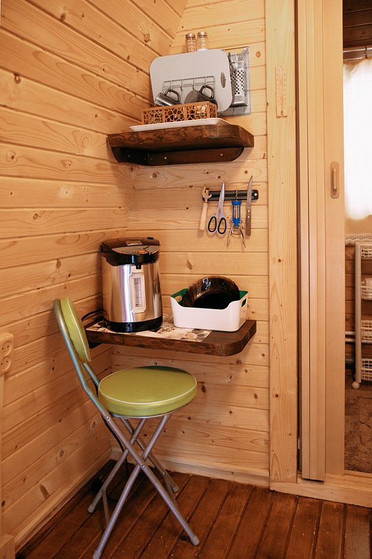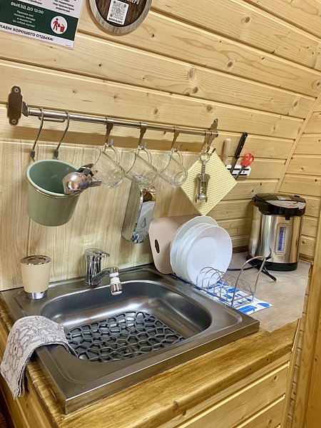 Несмотря на небольшую площадь, всего 12 м2, домик максимально полно и компактно оборудован всем необходимым для комфортного отдыха.