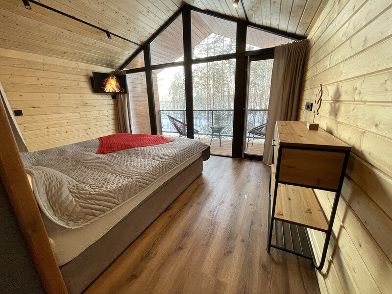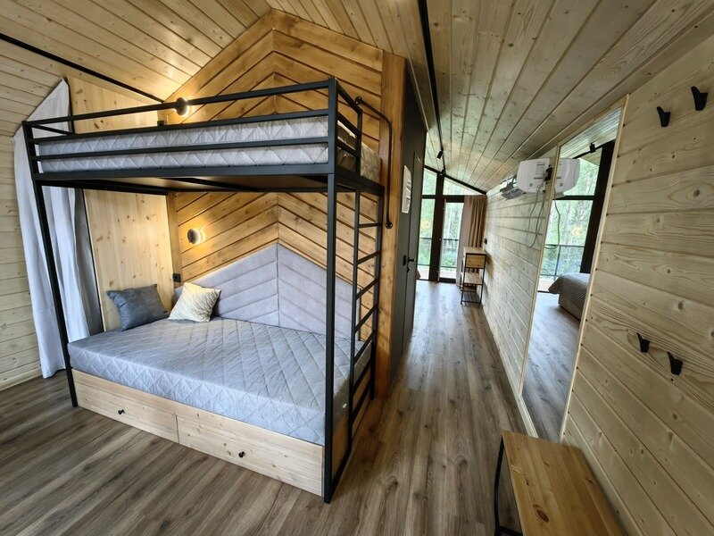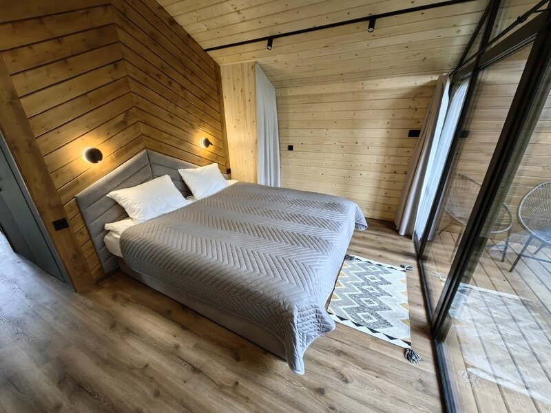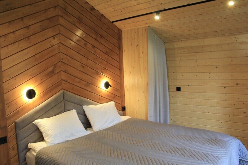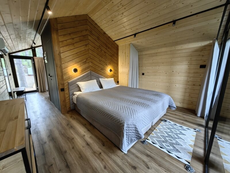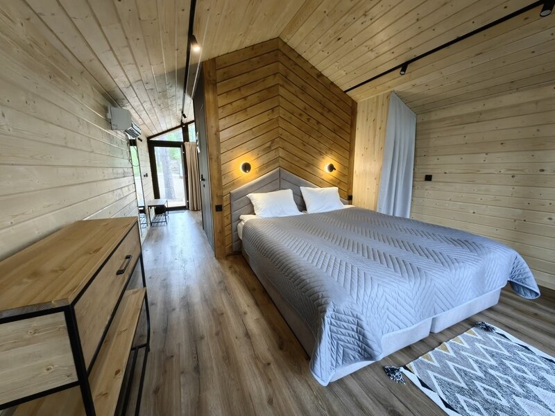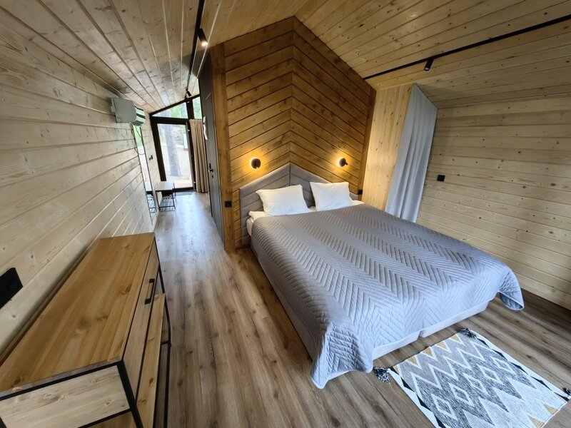 Для проживания доступны новые премиум-домики 2023 года, выполненные в стиле «барнхаус» вместимостью до четырёх человек, оборудованные всем необходимым для комфортного проживания.