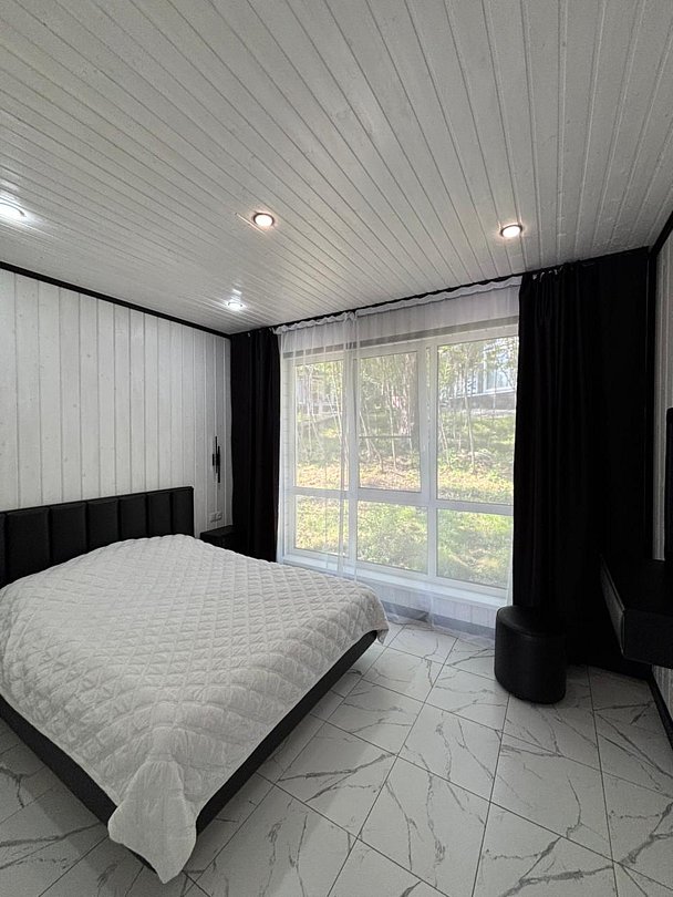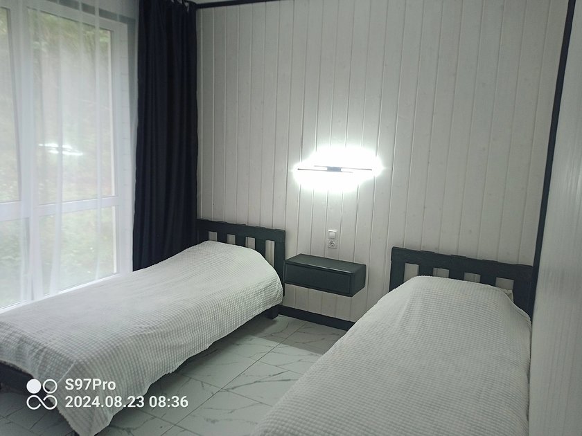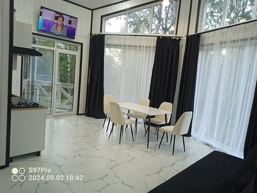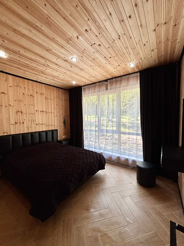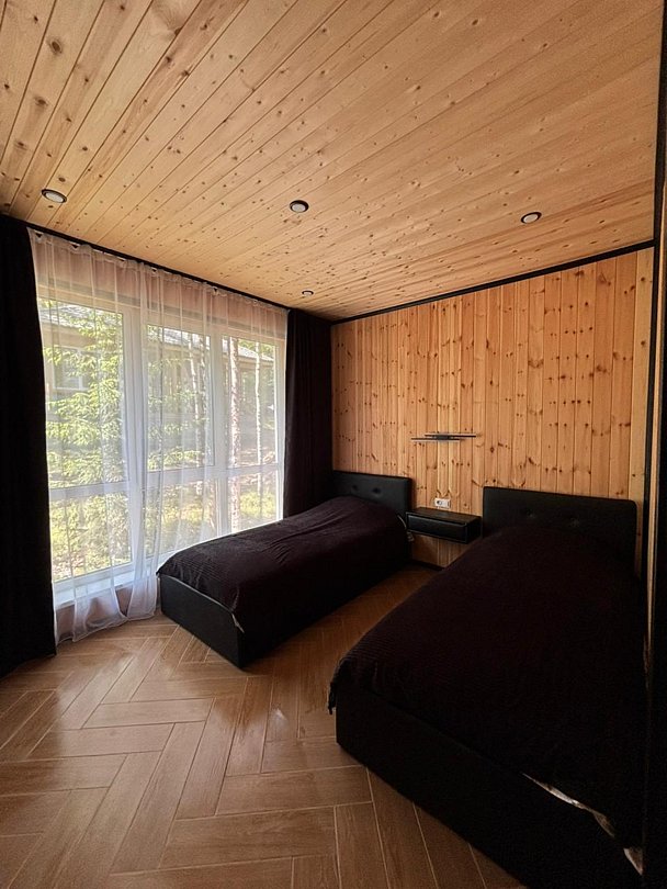 Семейный отдыхДостоинстваУютные домики в лесу, недалеко есть озеро в котором можно половить рыбу. Ремонт новый, все выглядит аккуратно и уютно, удобно что в одной комнате двухспальная кровать, а в другой - две односпальные, в доме есть сауна, а на улице чан. Отдых удался